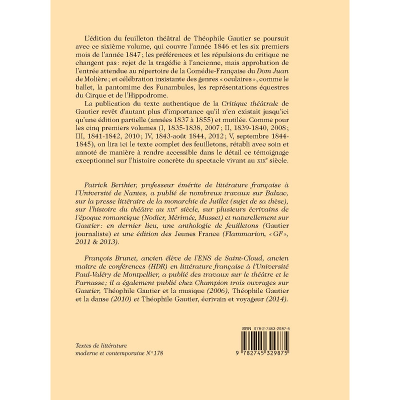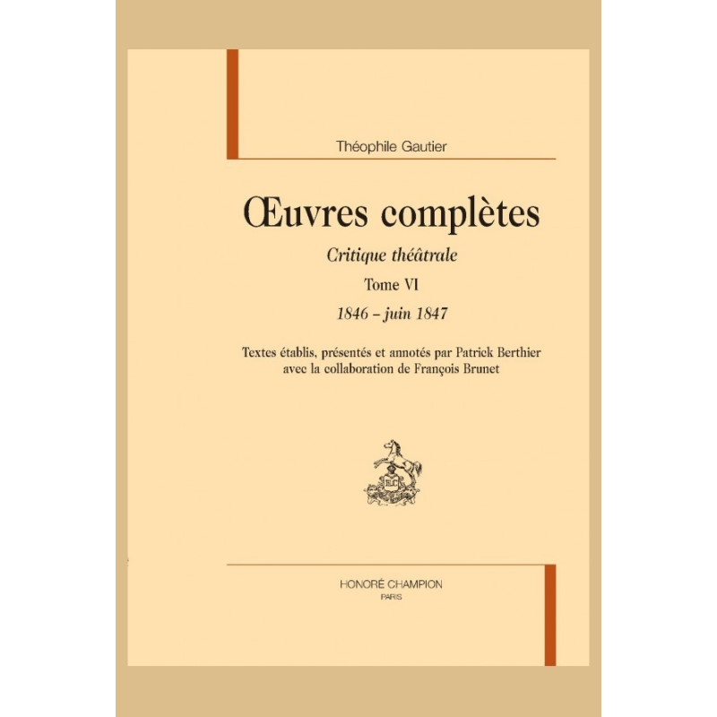 This is the 6th volume in the ongoing edition of Théophile Gautier’s theater reviews (an exceptional resource on the concrete history of the performing arts), covering the year 1846 and the first half of 1847. His likes (pantomime, the circus and other “ocular” genres) and dislikes (tragedy) remain much the same.