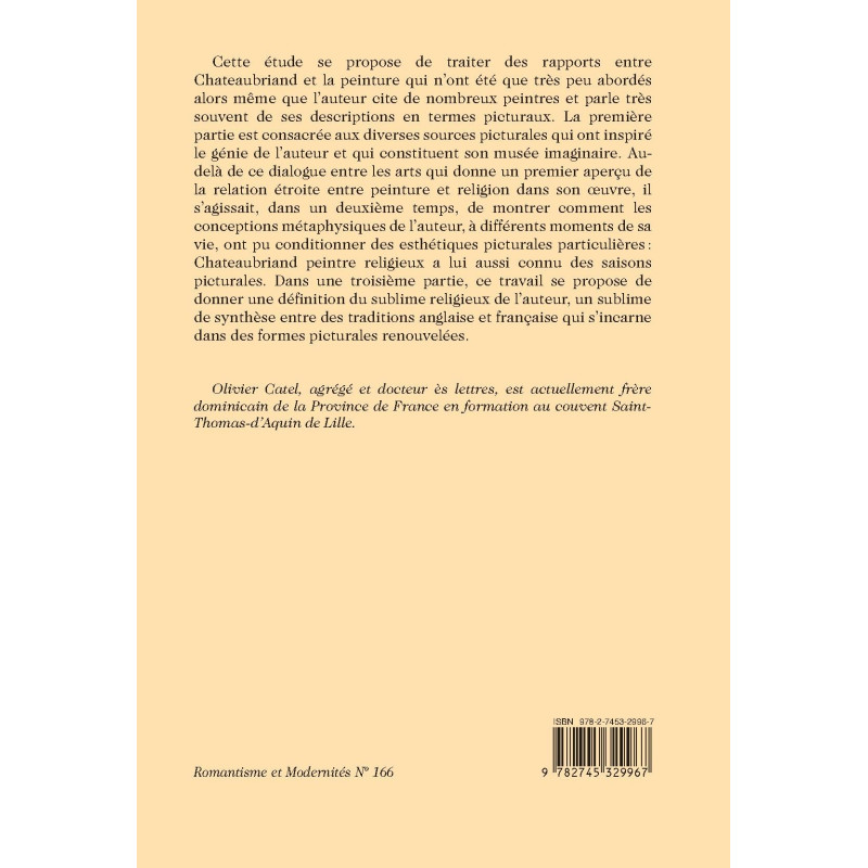Chateaubriand’s relationship with painting has seldom been analyzed. This study looks at the various pictorial sources that make up the writer’s imaginary museum, shows how his metaphysical conceptions led to specific pictorial aesthetics, and provides a definition of Chateaubriand’s religious sublime.