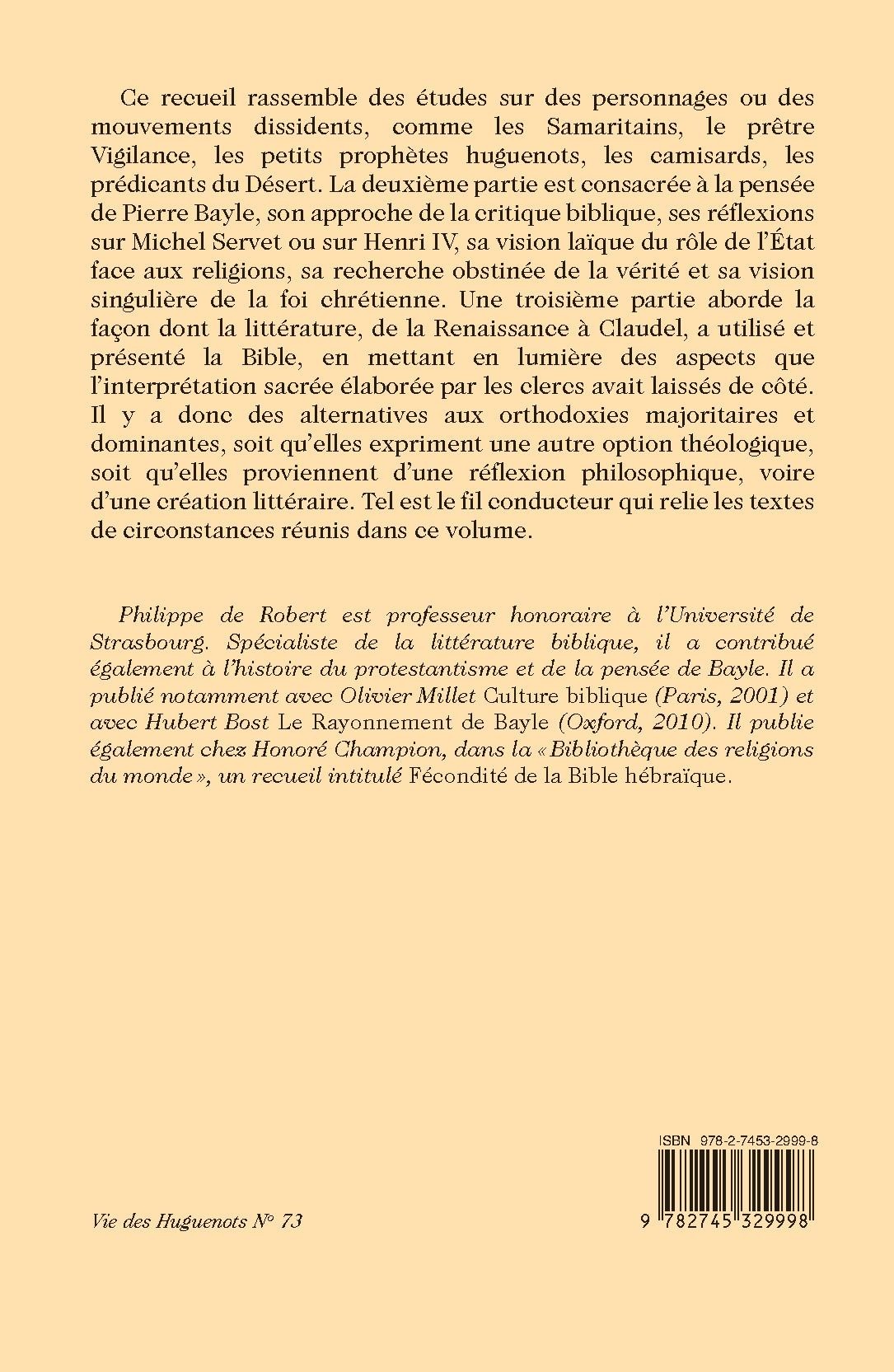 Ce recueil rassemble des études sur des personnages ou des mouvements dissidents, comme les Samaritains, le prêtre Vigilance, les petits prophètes huguenots, les camisards, les prédicants du Désert. La deuxième partie est consacrée à la pensée de Pierre Bayle, son approche de la critique biblique, ses réflexions sur Michel Servet ou sur Henri IV, sa vision laïque du rôle de l’État face aux religions, sa recherche obstinée de la vérité et sa vision singulière de la foi chrétienne. Une troisième partie aborde la façon dont la littérature, de la Renaissance à Claudel, a utilisé et présenté la Bible, en mettant en lumière des aspects que l’interprétation sacrée élaborée par les clercs avait laissés de côté. Il y a donc des alternatives aux orthodoxies majoritaires et dominantes, soit qu’elles expriment une autre option théologique, soit qu’elles proviennent d’une réflexion philosophique, voire d’une création littéraire. Tel est le fil conducteur qui relie les textes de circonstances réunis dans ce volume.