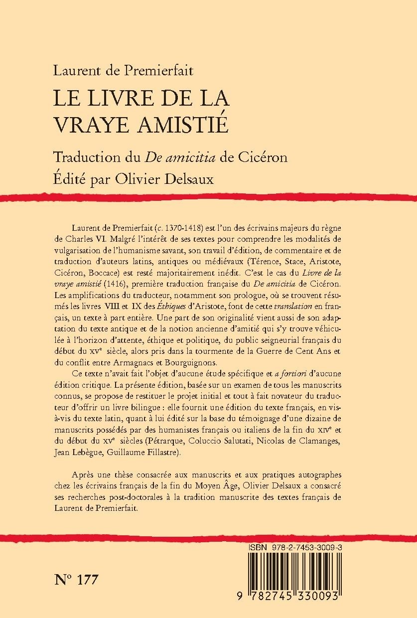 Laurent de Premierfait’s work as an editor, commentator and translator has remained largely unpublished. This is an edition of his Livre de la vraye amistié (1416), the first translation of Cicero’s De amicitia into French. Premierfait’s prologue and other additions make this bilingual volume a text in its own right