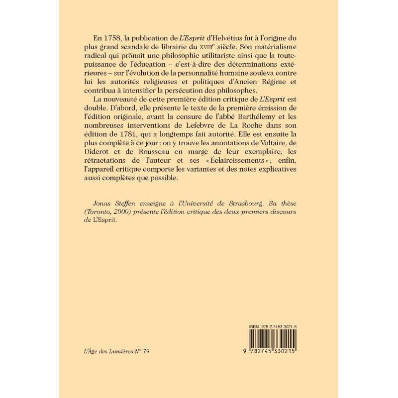 La nouveauté de cette première édition critique de L’Esprit est double. D’abord, elle présente le texte de la première émission de l’édition originale, avant la censure de l’abbé Barthélemy et les nombreuses interventions de Lefebvre de La Roche dans son édition de 1781, qui a longtemps fait autorité. Elle est ensuite la plus complète à ce jour: on y trouve les annotations de Voltaire, de Diderot et de Rousseau en marge de leur exemplaire, les rétractations de l’auteur et ses « Éclaircissements »; enfin, l’appareil critique comporte les variantes et des notes explicatives aussi complètes que possible.