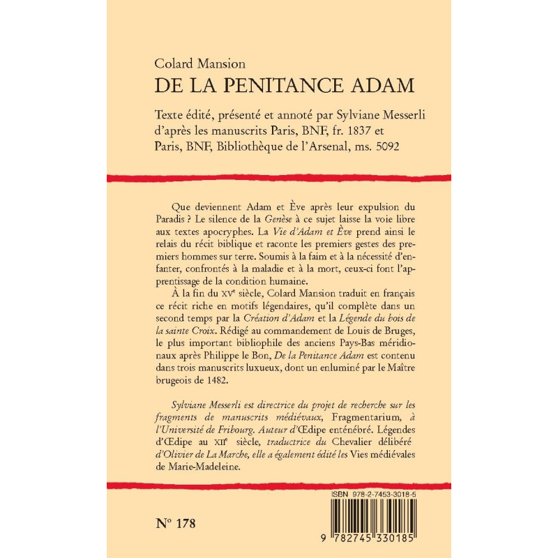 À la fin du XVe siècle, Colard Mansion traduit en français ce récit riche en motifs légendaires, qu’il complète dans un second temps par la Création d’Adam et la Légende du bois de la sainte Croix. Rédigé au commandement de Louis de Bruges, le plus important bibliophile des anciens Pays-Bas méridionaux après Philippe le Bon, De la Penitance Adam est contenu dans trois manuscrits luxueux, dont un enluminé par le Maître brugeois de 1482.