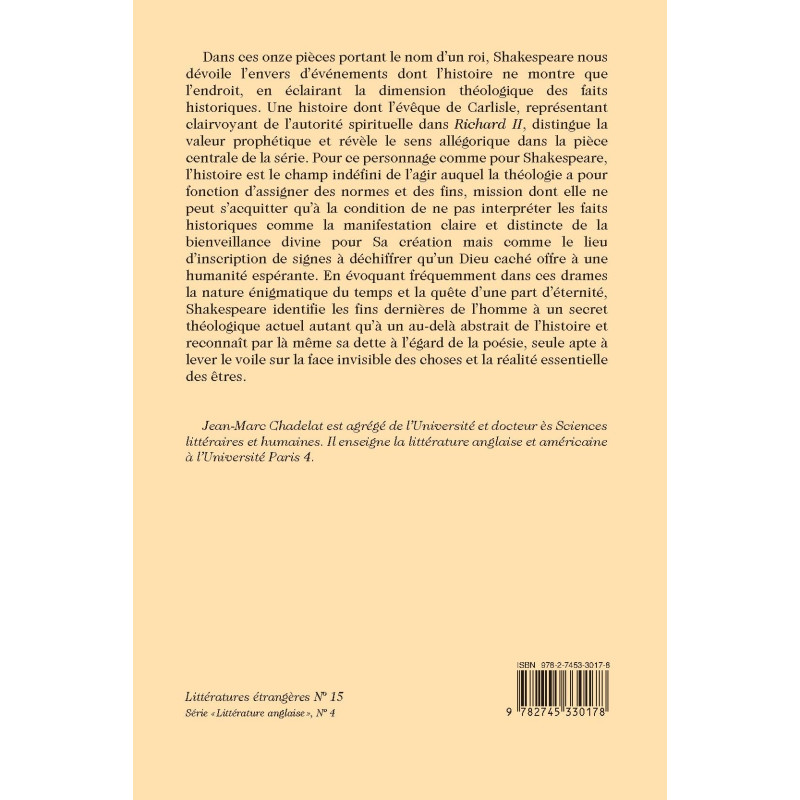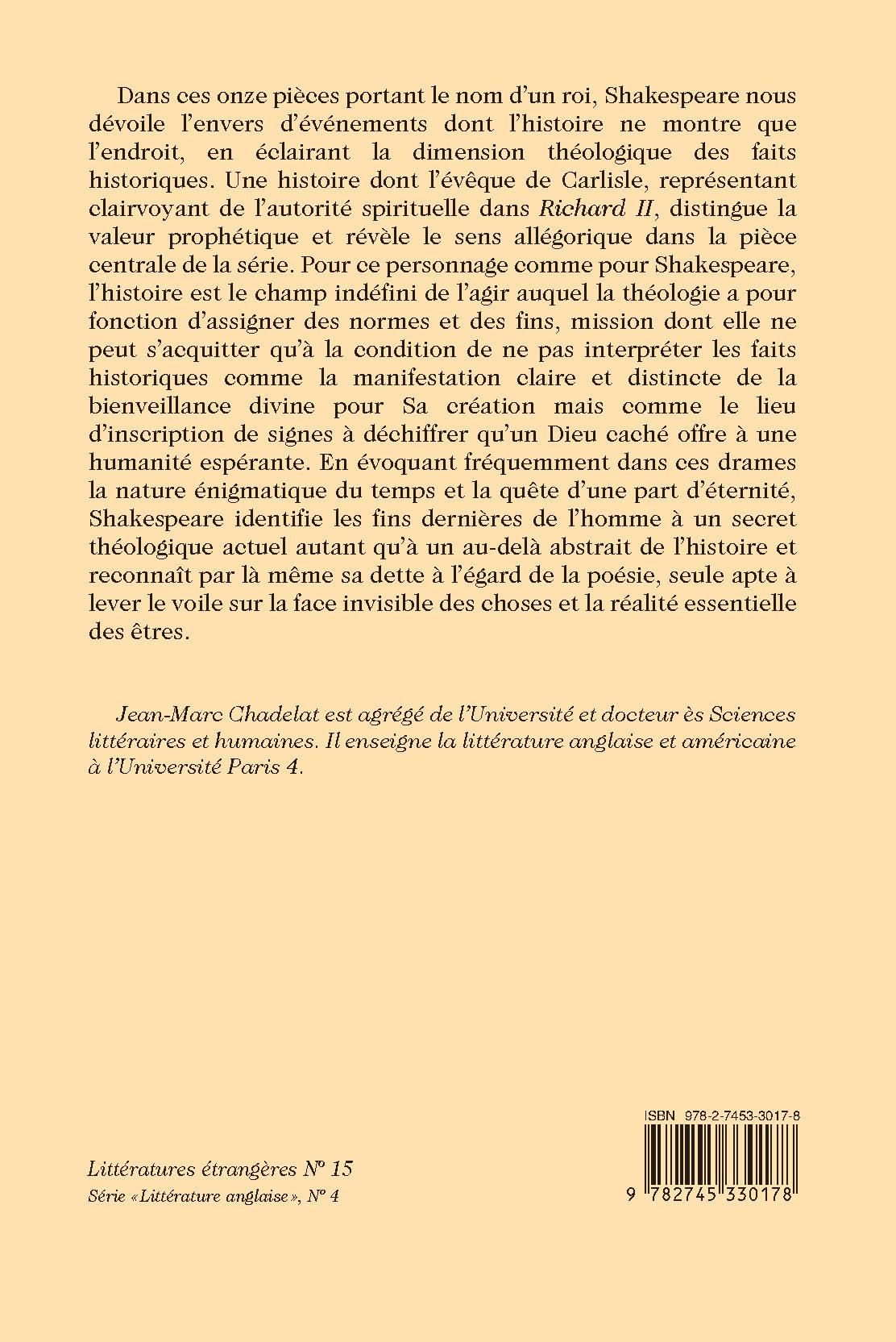 Dans ces onze pièces portant le nom d’un roi, Shakespeare nous dévoile l’envers d’événements dont l’histoire ne montre que l’endroit, en éclairant la dimension théologique des faits historiques. Une histoire dont l’évêque de Carlisle, représentant clairvoyant de l’autorité spirituelle dans Richard II, distingue la valeur prophétique et révèle le sens allégorique dans la pièce centrale de la série. Pour ce personnage comme pour Shakespeare, l’histoire est le champ indéfini de l’agir auquel la théologie a pour fonction d’assigner des normes et des fins, mission dont elle ne peut s’acquitter qu’à la condition de ne pas interpréter les faits historiques comme la manifestation claire et distincte de la bienveillance divine pour Sa création mais comme le lieu d’inscription de signes à déchiffrer qu’un Dieu caché offre à une humanité espérante. En évoquant fréquemment dans ces drames la nature énigmatique du temps et la quête d’une part d’éternité, Shakespeare identifie les fins dernières de l’homme à un secret théologique actuel autant qu’à un au-delà abstrait de l’histoire et reconnaît par là même sa dette à l’égard de la poésie, seule apte à lever le voile sur la face invisible des choses et la réalité essentielle des êtres.