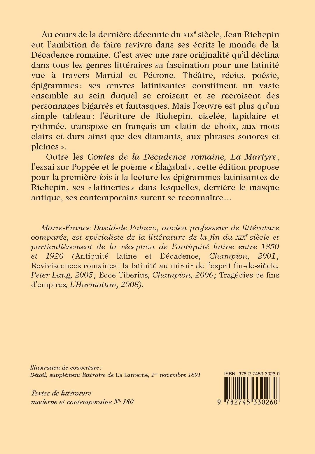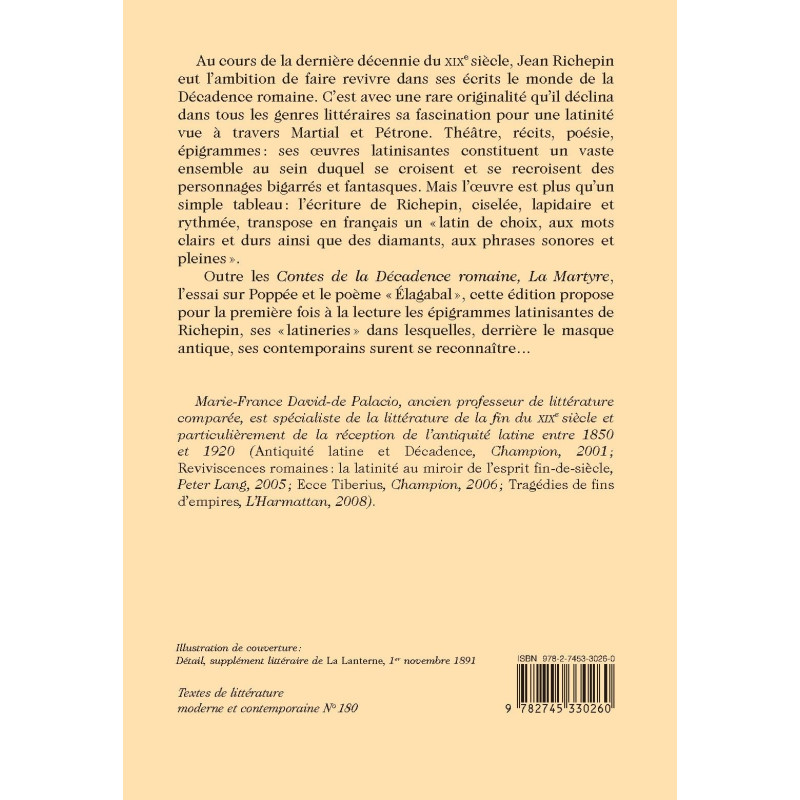 Outre les Contes de la Décadence romaine, La Martyre, l’essai sur Poppée et le poème « Élagabal », cette édition propose pour la première fois à la lecture les épigrammes latinisantes de Richepin, ses « latineries » dans lesquelles, derrière le masque antique, ses contemporains surent se reconnaître…