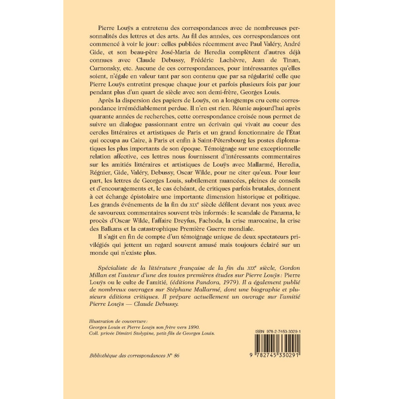 The daily correspondence (1890-1917) between the writer Pierre Louÿs and his half-brother Georges, a high-ranking diplomat, provides insightful commentary on the major events and on the leading writers and artists of the time, from the Panama Affair to World War I and from Mallarmé to Debussy.