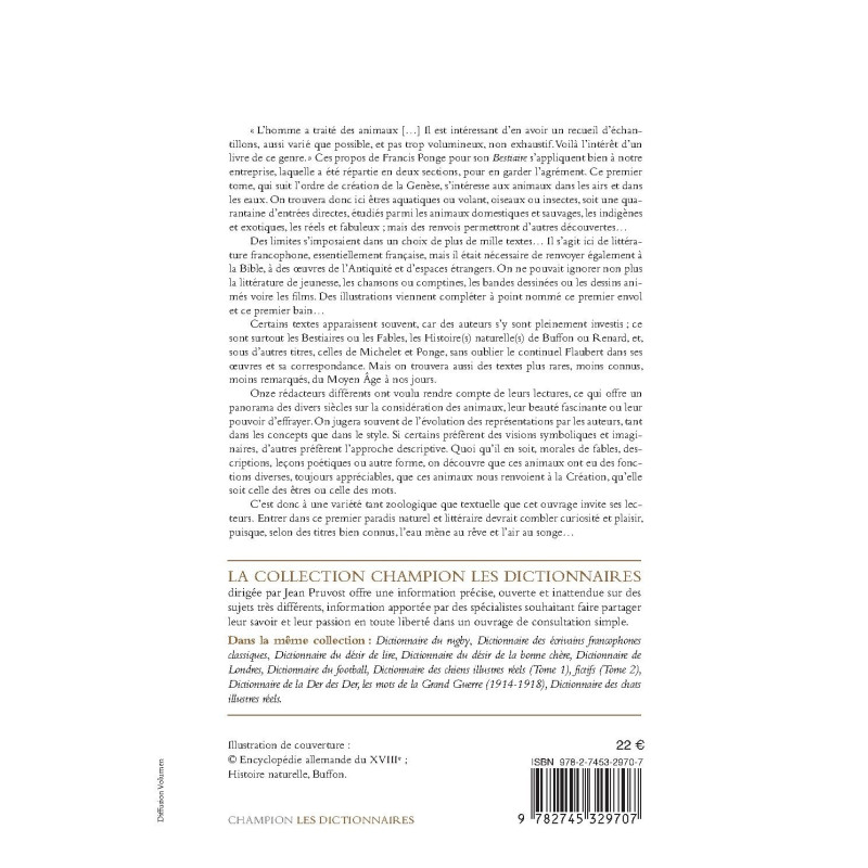 As the first part of a two-tome dictionary of the manifold animals that populate French literature, this volume focuses on the creatures inhabiting the sky and the sea, whether wild or domesticated, native or exotic, real or imaginary – a diversity echoed by that of the authors and texts herein mentioned.