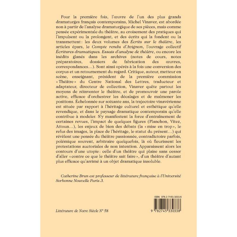 Michel Vinaver’s oeuvre is here approached, not through the dramaturgic analysis of his plays, but as an experimental conception of the theater. The analysis of his 60-year trajectory sheds light on both the history of contemporary theater and the personal utopia of an intractable dramatic object.