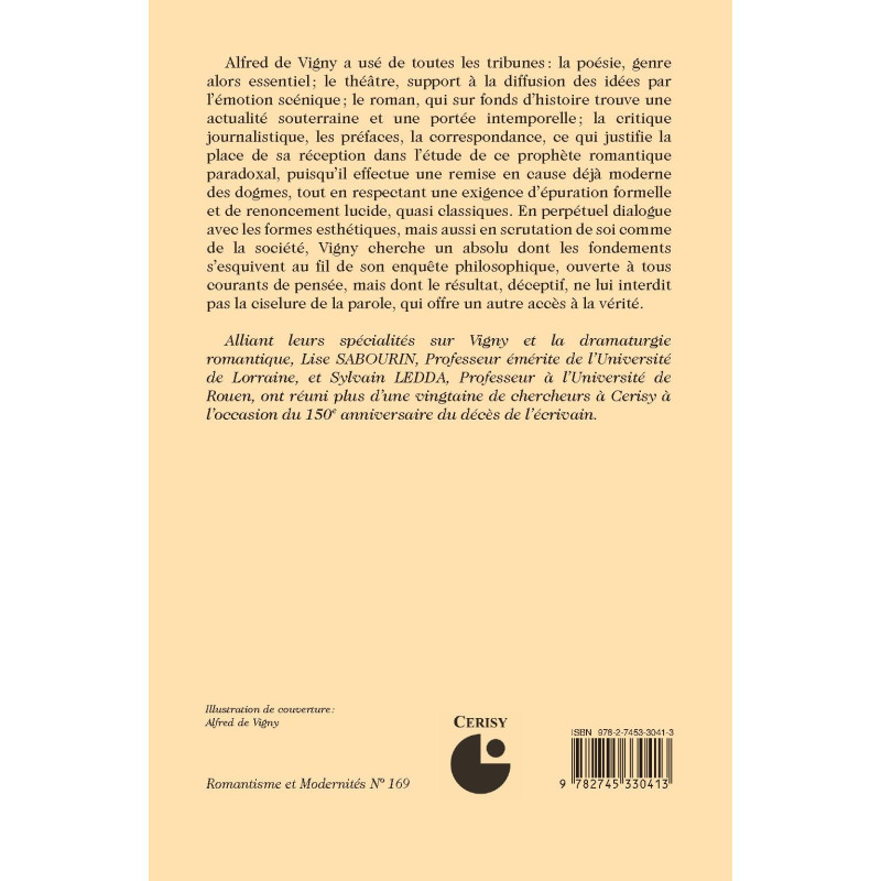 Alfred de Vigny a usé de toutes les tribunes : la poésie, genre alors essentiel ; le théâtre, support à la diffusion des idées par l’émotion scénique ; le roman, qui sur fonds d’histoire trouve une actualité souterraine et une portée intemporelle ; la critique journalistique, les préfaces, la correspondance, ce qui justifie la place de sa réception dans l’étude de ce prophète romantique paradoxal, puisqu’il effectue une remise en cause déjà moderne des dogmes, tout en respectant une exigence d’épuration formelle et de renoncement lucide, quasi classiques. En perpétuel dialogue avec les formes esthétiques, mais aussi en scrutation de soi comme de la société, Vigny cherche un absolu dont les fondements s’esquivent au fil de son enquête philosophique, ouverte à tous courants de pensée, mais dont le résultat, déceptif, ne lui interdit pas la ciselure de la parole, qui offre un autre accès à la vérité.