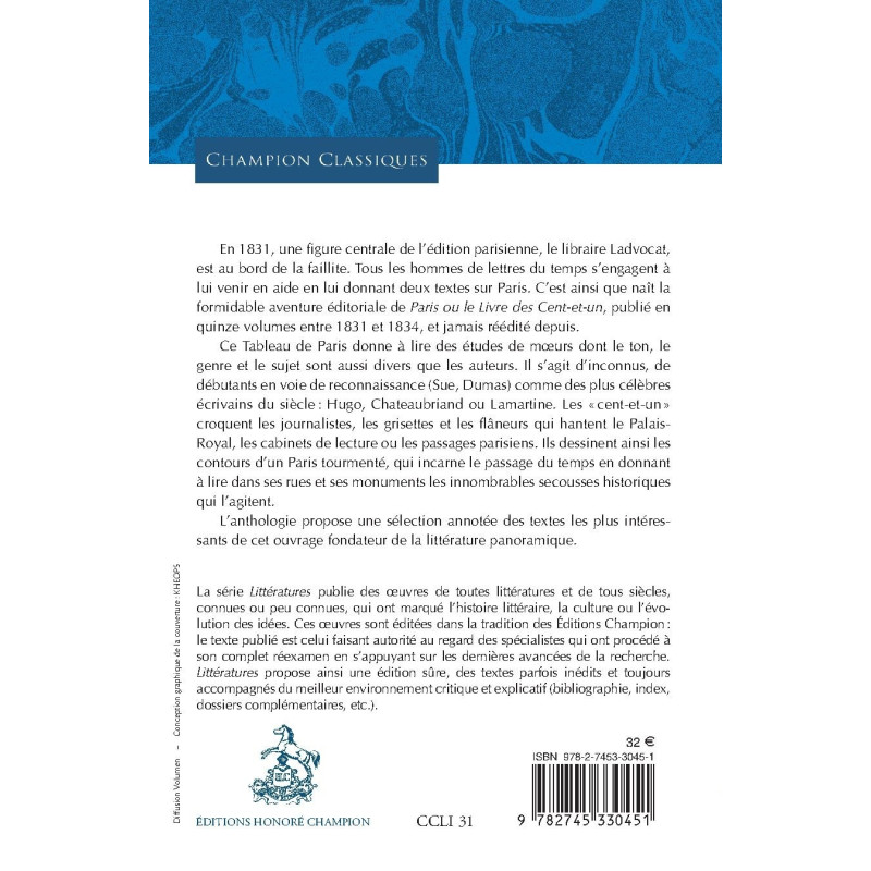 This anthology is a selection of texts about Paris first published between 1831 and 1834, written by relative beginners (Sue, Dumas…) as well as some of the greatest writers of the time (Hugo, Chateaubriand…) to save a well-known editor from bankruptcy. They paint a precise picture of the city and its literary life.
