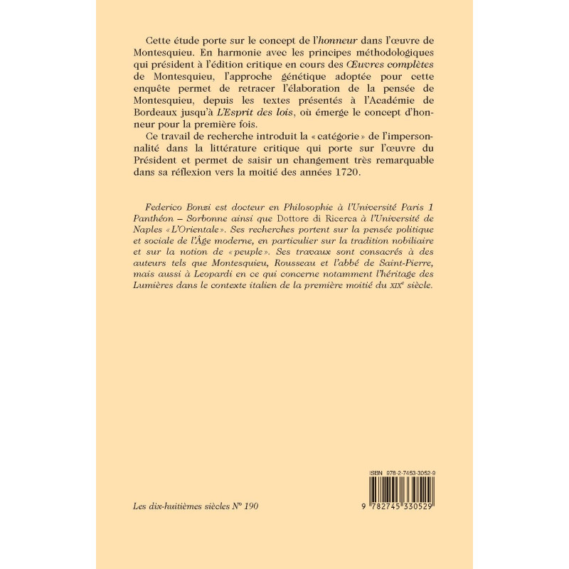 This essay focuses on the concept of honor in the works of Montesquieu. Based on a genetic approach (supplemented by a few concepts borrowed from the recent critical literature), this investigation traces the progression of Montesquieu’s ideas, from the texts presented at the Académie de Bordeaux to L’Esprit des lois.