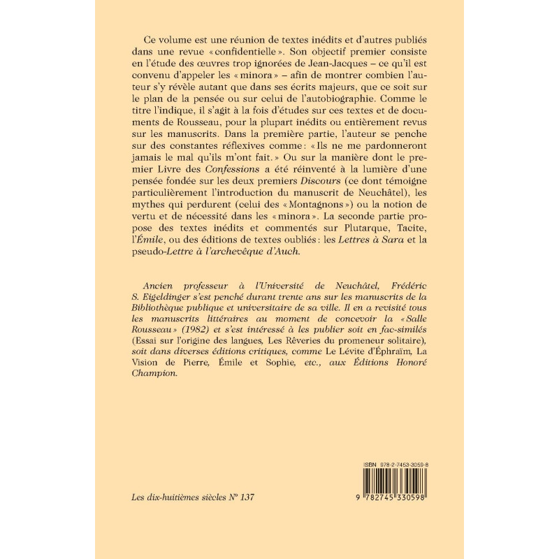 Ancien professeur à l’Université de Neuchâtel, Frédéric S. Eigeldinger s’est penché durant trente ans sur les manuscrits de la Bibliothèque publique et universitaire de sa ville. Il en a revisité tous les manuscrits littéraires au moment de concevoir la « Salle Rousseau » (1982) et s’est intéressé à les publier soit en fac-similés (Essai sur l’origine des langues, Les Rêveries du promeneur solitaire), soit dans diverses éditions critiques, comme Le Lévite d’Éphraïm, La Vision de Pierre, Émile et Sophie, etc., aux Éditions Honoré Champion.