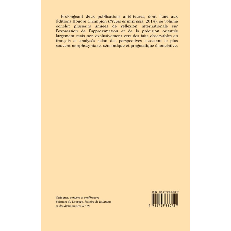 Prolongeant deux publications antérieures, dont l’une aux Éditions Honoré Champion (Précis et imprécis, 2014), ce volume conclut plusieurs années de réflexion internationale sur l’expression de l’approximation et de la précision orientée largement mais non exclusivement vers des faits observables en français et analysés selon des perspectives associant le plus souvent morphosyntaxe, sémantique et pragmatique énonciative.
