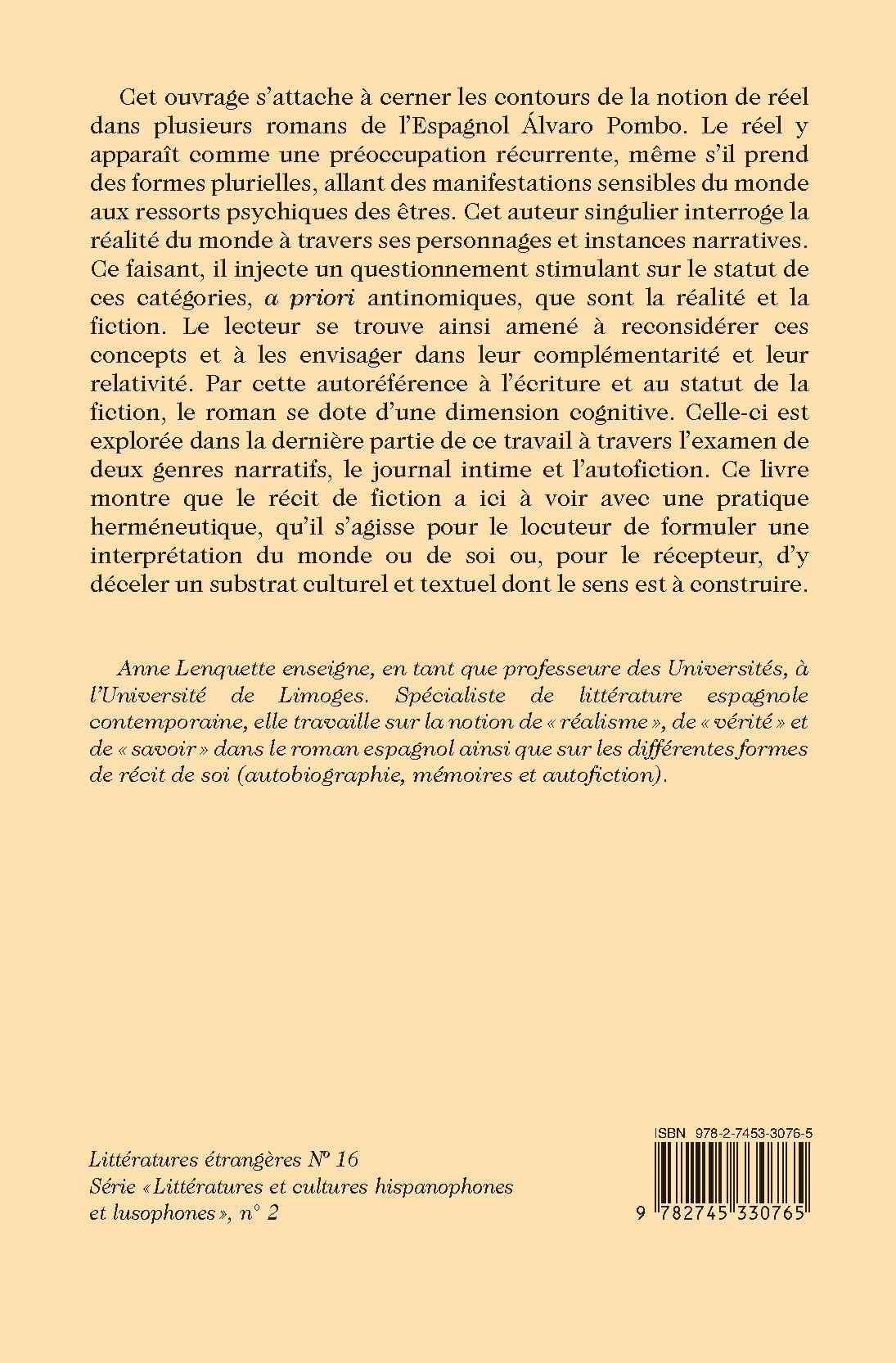 Cet ouvrage s’attache à cerner les contours de la notion de réel dans plusieurs romans de l’Espagnol Álvaro Pombo. Le réel y apparaît comme une préoccupation récurrente, même s’il prend des formes plurielles, allant des manifestations sensibles du monde aux ressorts psychiques des êtres. Cet auteur singulier interroge la réalité du monde à travers ses personnages et instances narratives. Ce faisant, il injecte un questionnement stimulant sur le statut de ces catégories, a priori antinomiques, que sont la réalité et la fiction. Le lecteur se trouve ainsi amené à reconsidérer ces concepts et à les envisager dans leur complémentarité et leur relativité. Par cette autoréférence à l’écriture et au statut de la fiction, le roman se dote d’une dimension cognitive. Celle-ci est explorée dans la dernière partie de ce travail à travers l’examen de deux genres narratifs, le journal intime et l’autofiction. Ce livre montre que le récit de fiction a ici à voir avec une pratique herméneutique, qu’il s’agisse pour le locuteur de formuler une interprétation du monde ou de soi ou, pour le récepteur, d’y déceler un substrat culturel et textuel dont le sens est à construire.