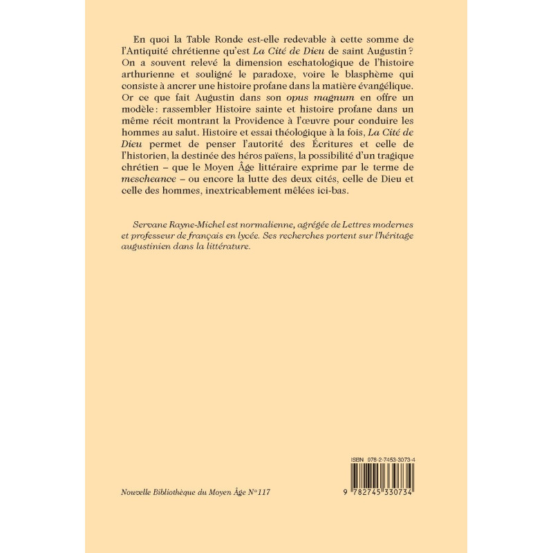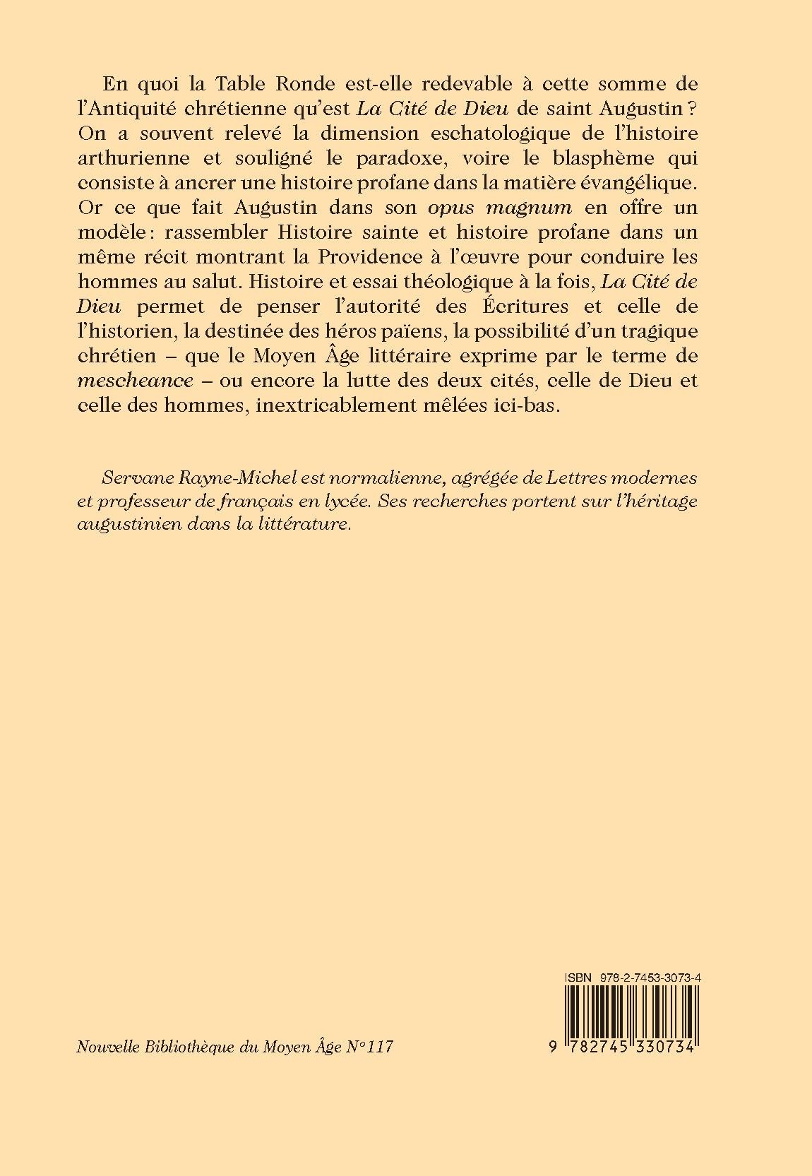 En quoi la Table Ronde est-elle redevable à cette somme de l’Antiquité chrétienne qu’est La Cité de Dieu de saint Augustin? On a souvent relevé la dimension eschatologique de l’histoire arthurienne et souligné le paradoxe, voire le blasphème qui consiste à ancrer une histoire profane dans la matière évangélique. Or ce que fait Augustin dans son opus magnum en offre un modèle : rassembler Histoire sainte et histoire profane dans un même récit montrant la Providence à l’oeuvre pour conduire les hommes au salut. Histoire et essai théologique à la fois, La Cité de Dieu permet de penser l’autorité des Écritures et celle de l’historien, la destinée des héros païens, la possibilité d’un tragique chrétien – que le Moyen Âge littéraire exprime par le terme de mescheance – ou encore la lutte des deux cités, celle de Dieu et celle des hommes, inextricablement mêlées ici-bas.