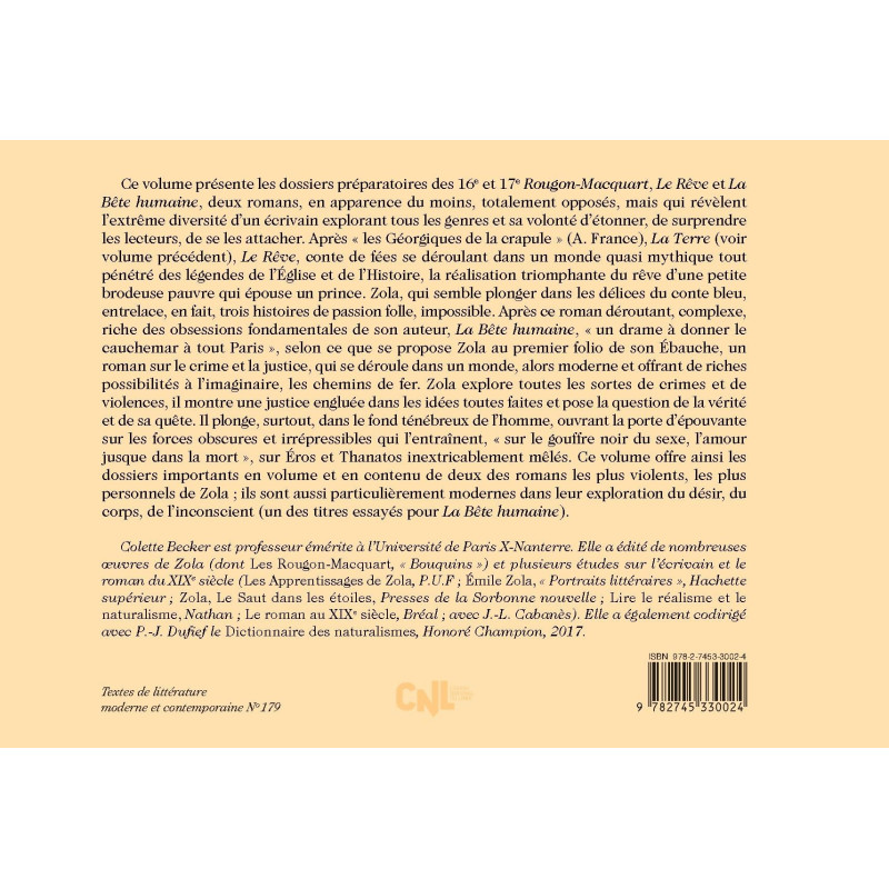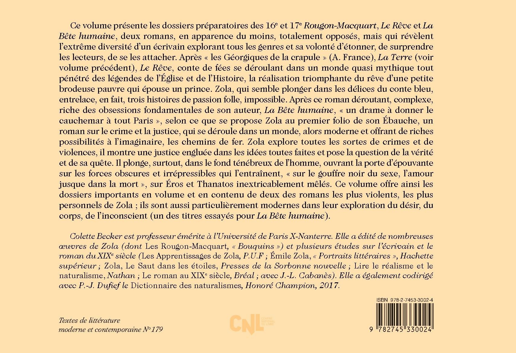 Ce volume présente les dossiers préparatoires des 16e et 17e Rougon-Macquart, Le Rêve et La Bête humaine, deux romans, en apparence du moins, totalement opposés, mais qui révèlent l’extrême diversité d’un écrivain explorant tous les genres et sa volonté d’étonner, de surprendre les lecteurs, de se les attacher. Après « les Géorgiques de la crapule » (A. France), La Terre (voir volume précédent), Le Rêve, conte de fées se déroulant dans un monde quasi mythique tout pénétré des légendes de l’Église et de l’Histoire, la réalisation triomphante du rêve d’une petite brodeuse pauvre qui épouse un prince. Zola, qui semble plonger dans les délices du conte bleu, entrelace, en fait, trois histoires de passion folle, impossible. Après ce roman déroutant, complexe, riche des obsessions fondamentales de son auteur, La Bête humaine, « un drame à donner le cauchemar à tout Paris », selon ce que se propose Zola au premier folio de son Ébauche, un roman sur le crime et la justice, qui se déroule dans un monde, alors moderne et offrant de riches possibilités à l’imaginaire, les chemins de fer. Zola explore toutes les sortes de crimes et de violences, il montre une justice engluée dans les idées toutes faites et pose la question de la vérité et de sa quête. Il plonge, surtout, dans le fond ténébreux de l’homme, ouvrant la porte d’épouvante sur les forces obscures et irrépressibles qui l’entraînent, « sur le gouffre noir du sexe, l’amour jusque dans la mort », sur Éros et Thanatos inextricablement mêlés. Ce volume offre ainsi les dossiers importants en volume et en contenu de deux des romans les plus violents, les plus personnels de Zola ; ils sont aussi particulièrement modernes dans leur exploration du désir, du corps, de l’inconscient (un des titres essayés pour La Bête humaine).