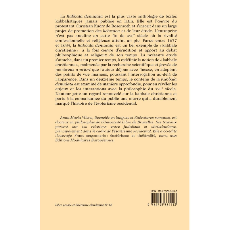 La Kabbala denudata est la plus vaste anthologie de textes kabbalistiques jamais publiée en latin. Elle est l’oeuvre du protestant Christian Knorr de Rosenroth et s’inscrit dans un large projet de promotion des hebraica et de leur étude. L’entreprise n’est pas anodine en cette fin de XVIIe siècle où la rivalité confessionnelle et religieuse atteint un pic. Parue entre 1677 et 1684, la Kabbala denudata est un bel exemple de « kabbale chrétienne », à la fois oeuvre d’érudition et apport au débat philosophique et religieux de son temps. La présente étude s’attache, dans un premier temps, à redéfinir la notion de « kabbale chrétienne », malmenée par la recherche scientifique et grevée de nombreux a priori que l’auteur déjoue avec finesse, en adoptant des points de vue nuancés, poussant l’interrogation au-delà de l’apparence. Dans un deuxième temps, le contenu de la Kabbala denudata est examiné de manière approfondie, pour en révéler les enjeux et les interactions avec la philosophie du XVIIe siècle. L’auteur jette un regard renouvelé sur la kabbale chrétienne et porte à la connaissance du public une oeuvre qui a durablement marqué l’histoire de l’ésotérisme occidental.