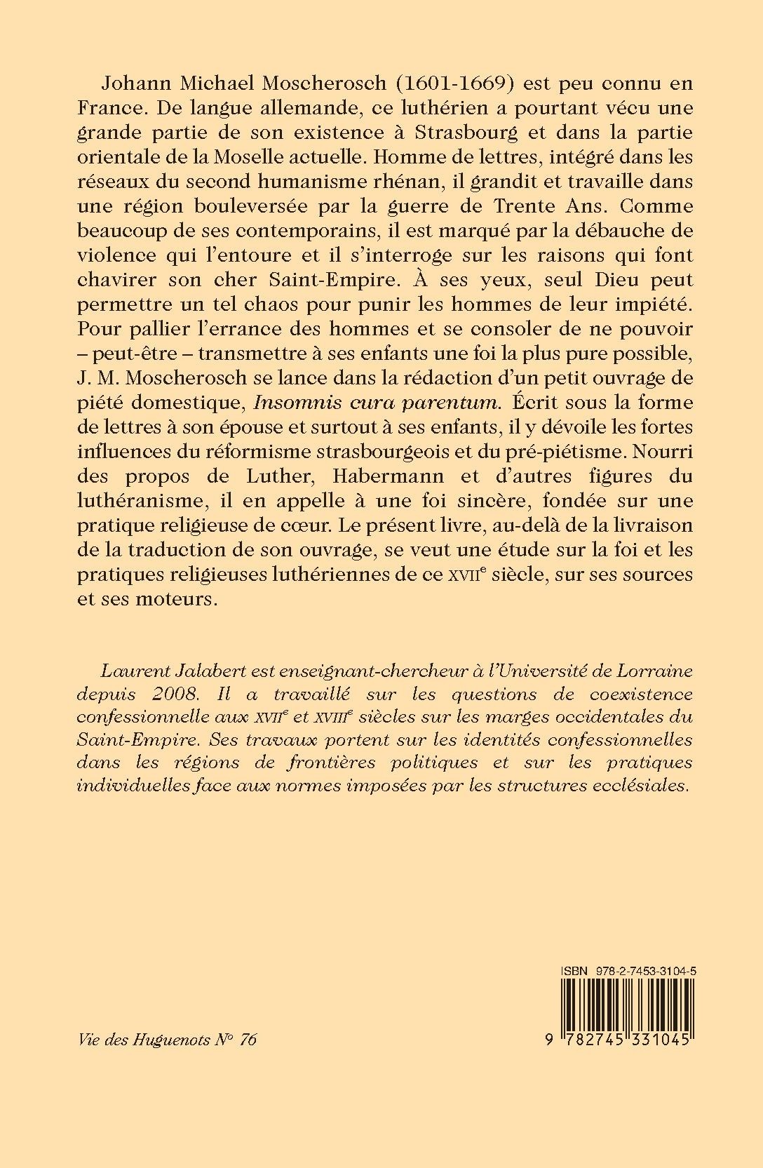 Johann Michael Moscherosch (1601-1669) est peu connu en France. De langue allemande, ce luthérien a pourtant vécu une grande partie de son existence à Strasbourg et dans la partie orientale de la Moselle actuelle. Homme de lettres, intégré dans les réseaux du second humanisme rhénan, il grandit et travaille dans une région bouleversée par la guerre de Trente Ans. Comme beaucoup de ses contemporains, il est marqué par la débauche de violence qui l’entoure et il s’interroge sur les raisons qui font chavirer son cher Saint-Empire. À ses yeux, seul Dieu peut permettre un tel chaos pour punir les hommes de leur impiété. Pour pallier l’errance des hommes et se consoler de ne pouvoir – peut-être – transmettre à ses enfants une foi la plus pure possible, J. M. Moscherosch se lance dans la rédaction d’un petit ouvrage de piété domestique, Insomnis cura parentum. Écrit sous la forme de lettres à son épouse et surtout à ses enfants, il y dévoile les fortes influences du réformisme strasbourgeois et du pré-piétisme. Nourri des propos de Luther, Habermann et d’autres figures du luthéranisme, il en appelle à une foi sincère, fondée sur une pratique religieuse de cœur. Le présent livre, au-delà de la livraison de la traduction de son ouvrage, se veut une étude sur la foi et les pratiques religieuses luthériennes de ce XVIIe siècle, sur ses sources et ses moteurs.