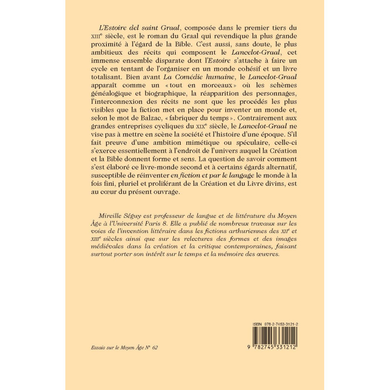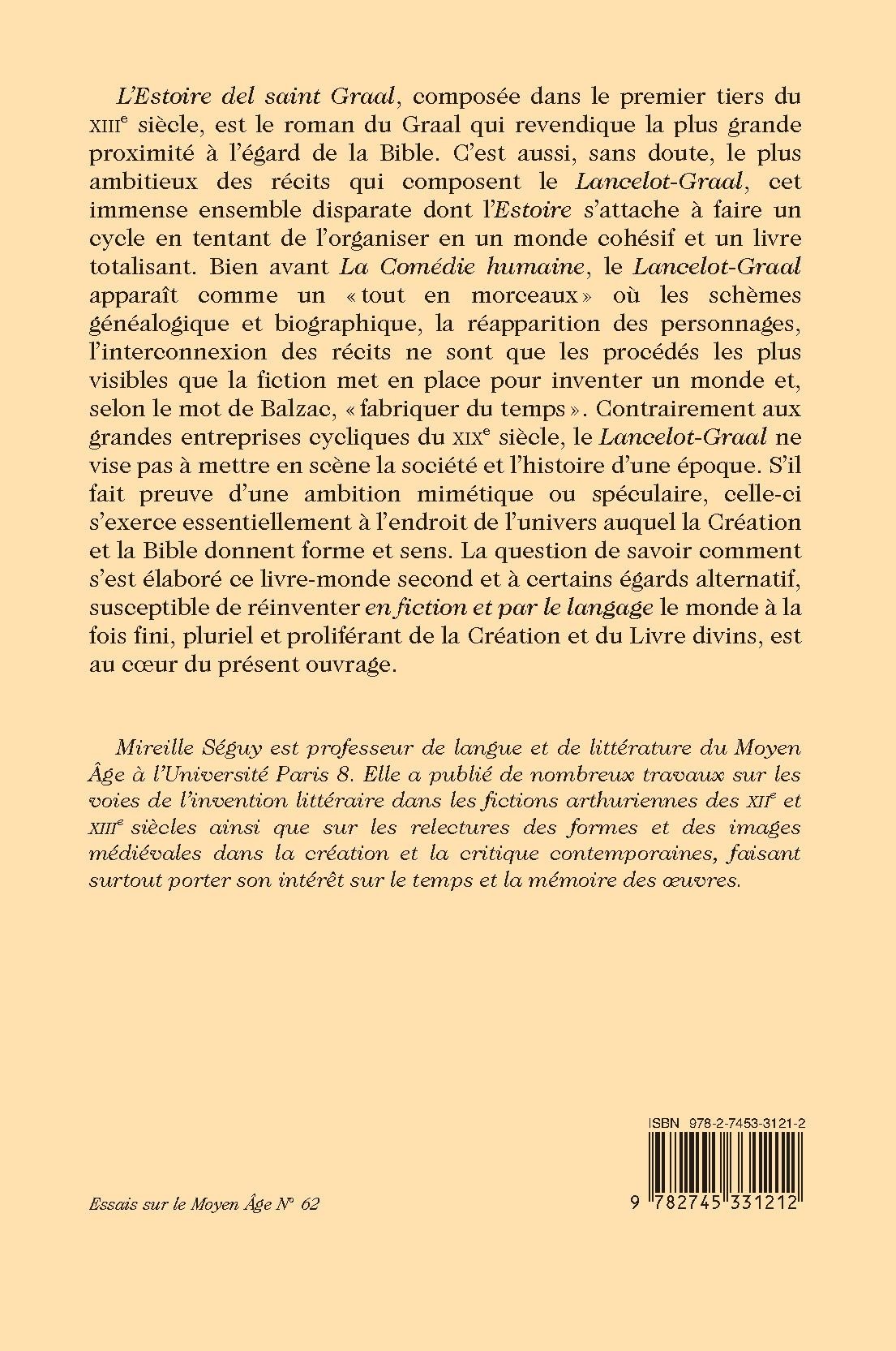 L’Estoire del saint Graal, composée dans le premier tiers du XIIIe siècle, est le roman du Graal qui revendique la plus grande proximité à l’égard de la Bible. C’est aussi, sans doute, le plus ambitieux des récits qui composent le Lancelot-Graal, cet immense ensemble disparate dont l’Estoire s’attache à faire un cycle en tentant de l’organiser en un monde cohésif et un livre totalisant. Bien avant La Comédie humaine, le Lancelot-Graal apparaît comme un «tout en morceaux» où les schèmes généalogique et biographique, la réapparition des personnages, l’interconnexion des récits ne sont que les procédés les plus visibles que la fiction met en place pour inventer un monde et, selon le mot de Balzac, « fabriquer du temps ». Contrairement aux grandes entreprises cycliques du XIXe siècle, le Lancelot-Graal ne vise pas à mettre en scène la société et l’histoire d’une époque. S’il fait preuve d’une ambition mimétique ou spéculaire, celle-ci s’exerce essentiellement à l’endroit de l’univers auquel la Création et la Bible donnent forme et sens. La question de savoir comment s’est élaboré ce livre-monde second et à certains égards alternatif, susceptible de réinventer en fiction et par le langage le monde à la fois fini, pluriel et proliférant de la Création et du Livre divins, est au cœur du présent ouvrage.