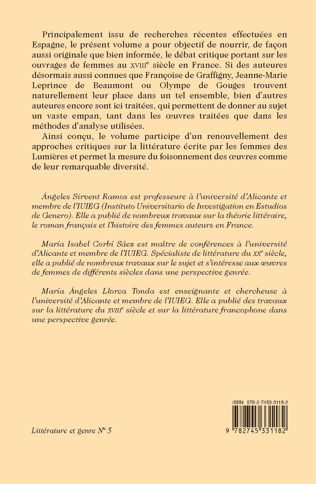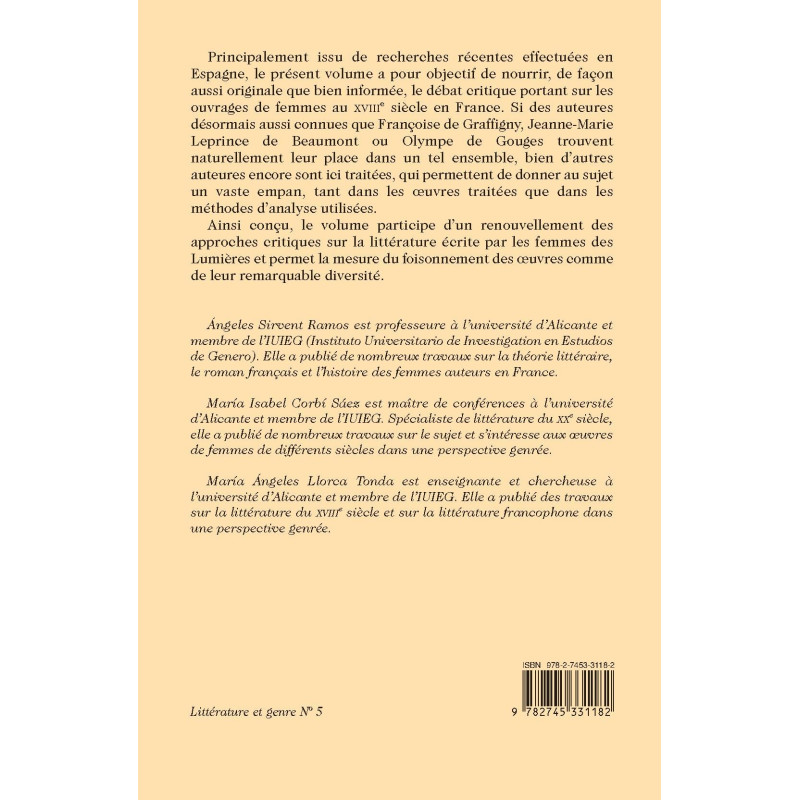 Principalement issu de recherches récentes effectuées en Espagne, le présent volume a pour objectif de nourrir, de façon aussi originale que bien informée, le débat critique portant sur les ouvrages de femmes au XVIIIe siècle en France. Si des auteures désormais aussi connues que Françoise de Graffigny, Jeanne-Marie Leprince de Beaumont ou Olympe de Gouges trouvent naturellement leur place dans un tel ensemble, bien d’autres auteures encore sont ici traitées, qui permettent de donner au sujet un vaste empan, tant dans les œuvres traitées que dans les méthodes d’analyse utilisées.