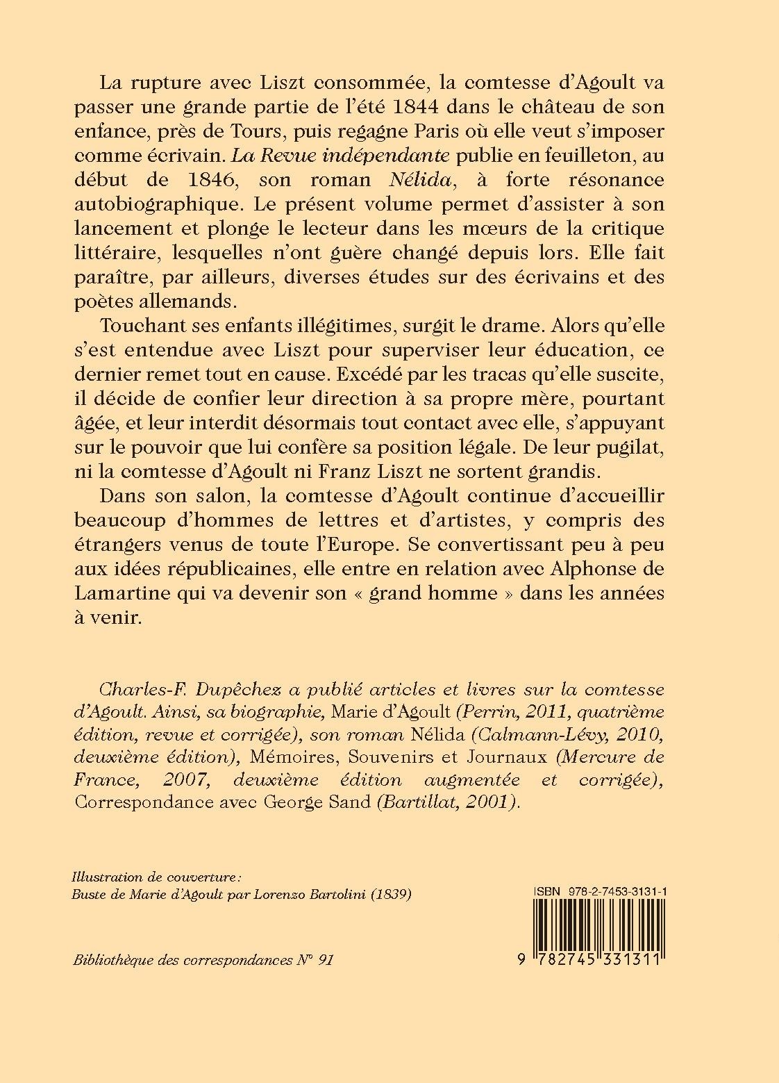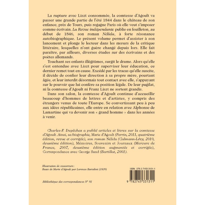 La rupture avec Liszt consommée, la comtesse d’Agoult va passer une grande partie de l’été 1844 dans le château de son enfance, près de Tours, puis regagne Paris où elle veut s’imposer comme écrivain. La Revue indépendante publie en feuilleton, au début de 1846, son roman Nélida, à forte résonance autobiographique. Le présent volume permet d’assister à son lancement et plonge le lecteur dans les mœurs de la critique littéraire, lesquelles n’ont guère changé depuis lors. Elle fait paraître, par ailleurs, diverses études sur des écrivains et des poètes allemands.