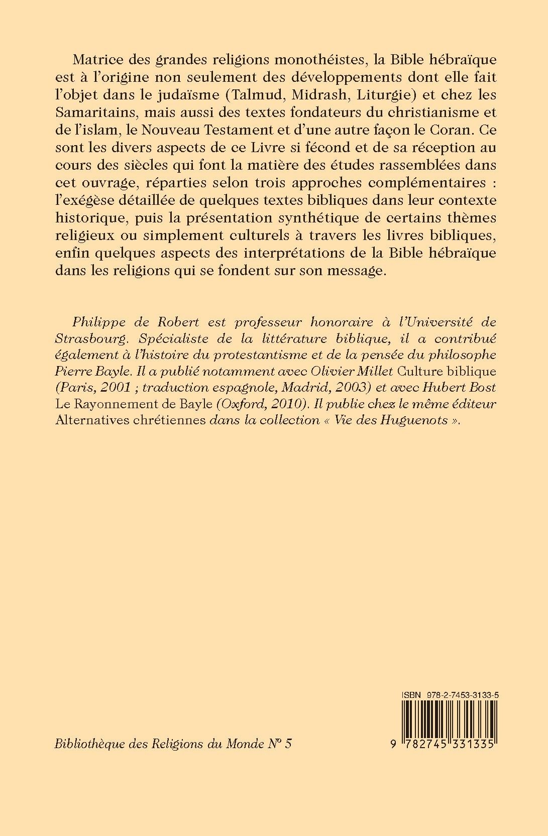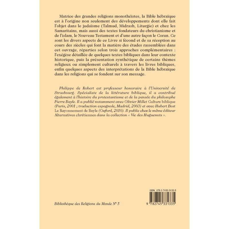 Matrice des grandes religions monothéistes, la Bible hébraïque est à l’origine non seulement des développements dont elle fait l’objet dans le judaïsme (Talmud, Midrash, Liturgie) et chez les Samaritains, mais aussi des textes fondateurs du christianisme et de l’islam, le Nouveau Testament et d’une autre façon le Coran. Ce sont les divers aspects de ce Livre si fécond et de sa réception au cours des siècles qui font la matière des études rassemblées dans cet ouvrage, réparties selon trois approches complémentaires : l’exégèse détaillée de quelques textes bibliques dans leur contexte historique, puis la présentation synthétique de certains thèmes religieux ou simplement culturels à travers les livres bibliques, enfin quelques aspects des interprétations de la Bible hébraïque dans les religions qui se fondent sur son message.