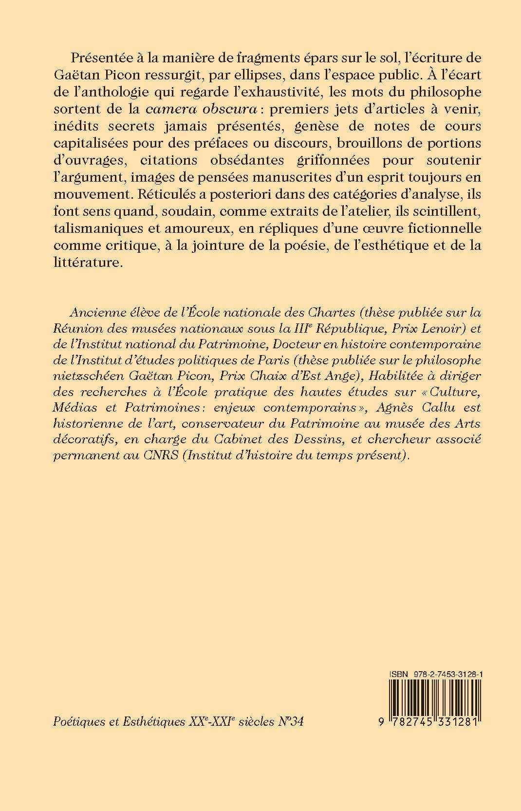 Instead of aiming at comprehensiveness, this study of Gaëtan Picon takes the essayist’s scattered words and makes them scintillate, loving and talisman-like, like so many replicas of a fictional and critical œuvre at the intersection of poetry, aesthetics and literature.