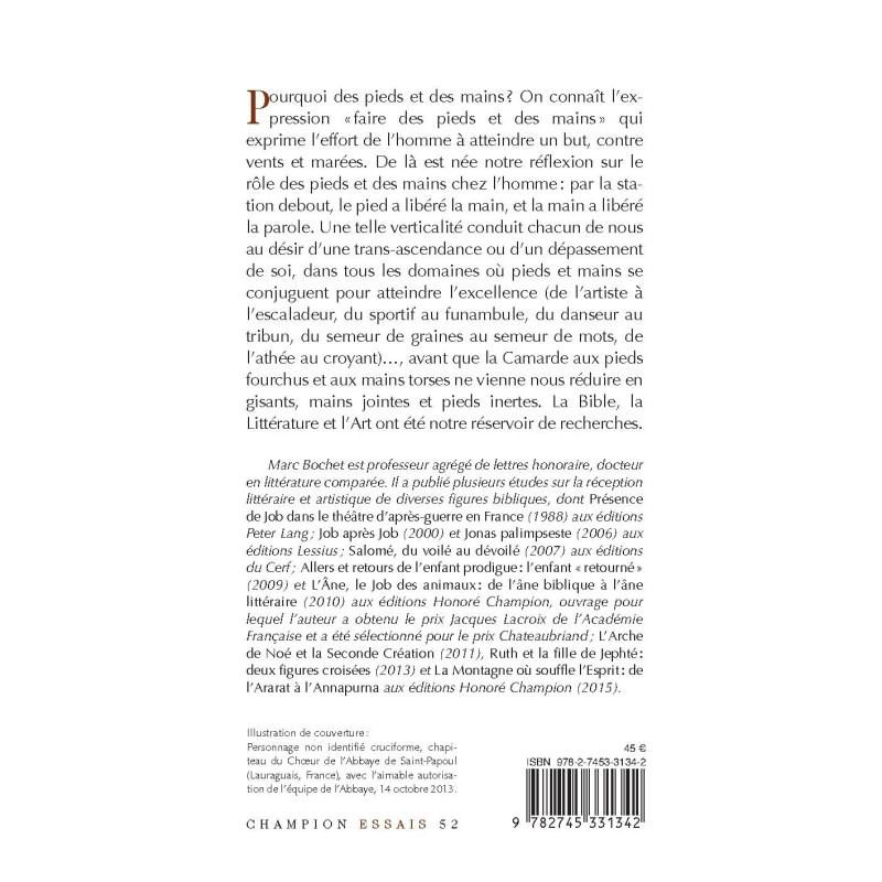 This essay on the role of man’s hands and feet found bountiful research areas in the Bible, Literature and Art. With the standing position, the foot liberated the hand, which in turn liberated speech – a verticality which enjoins us all to surpass ourselves wherever hands and feet are necessary to reach excellence.