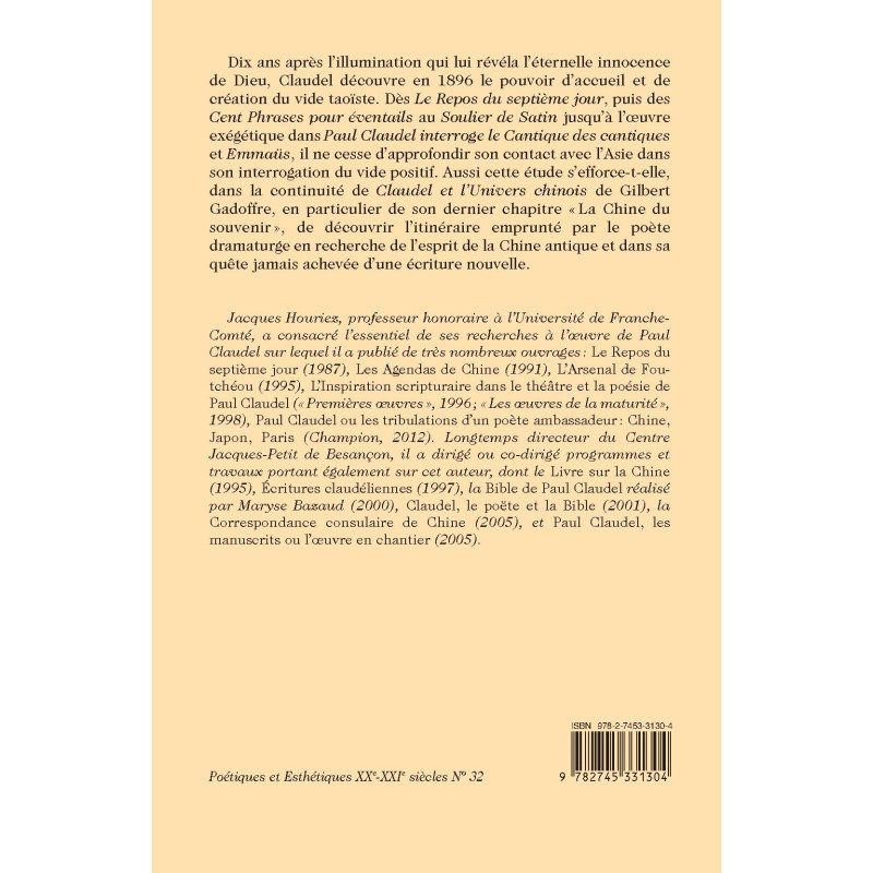 Dix ans après l’illumination qui lui révéla l’éternelle innocence de Dieu, Claudel découvre en 1896 le pouvoir d’accueil et de création du vide taoïste. Dès Le Repos du septième jour, puis des Cent Phrases pour éventails au Soulier de Satin jusqu’à l’oeuvre exégétique dans Paul Claudel interroge le Cantique des cantiques et Emmaüs, il ne cesse d’approfondir son contact avec l’Asie dans son interrogation du vide positif. Aussi cette étude s’efforce-t-elle, dans la continuité de Claudel et l’Univers chinois de Gilbert Gadoffre, en particulier de son dernier chapitre «La Chine du souvenir », de découvrir l’itinéraire emprunté par le poète dramaturge en recherche de l’esprit de la Chine antique et dans sa quête jamais achevée d’une écriture nouvelle.