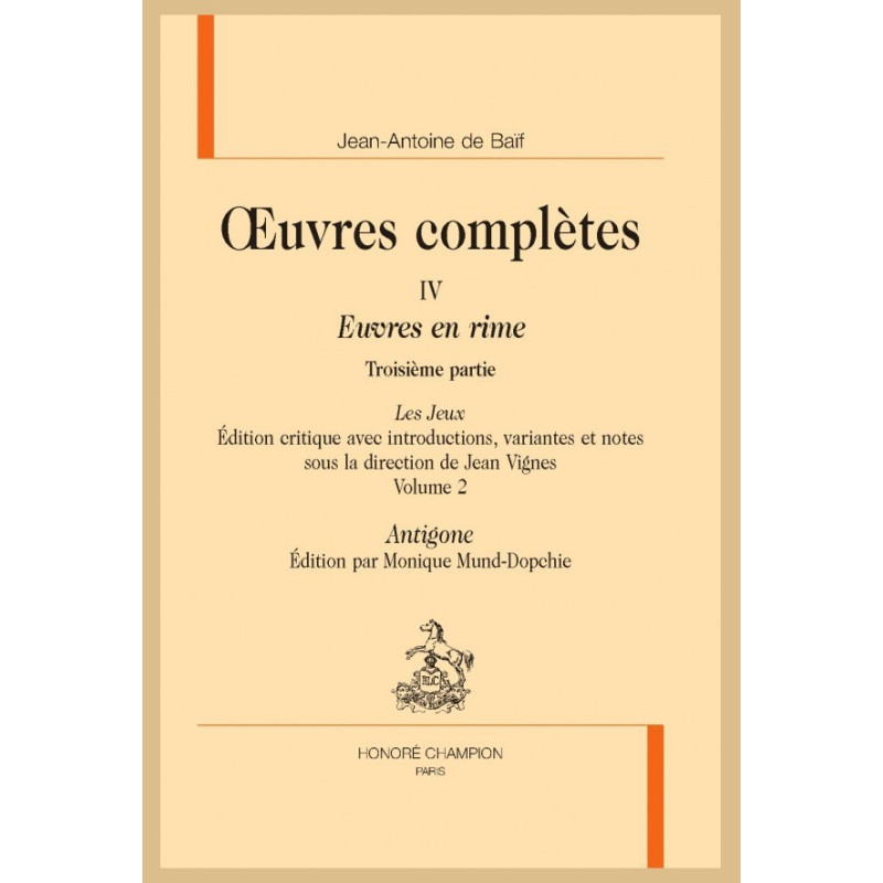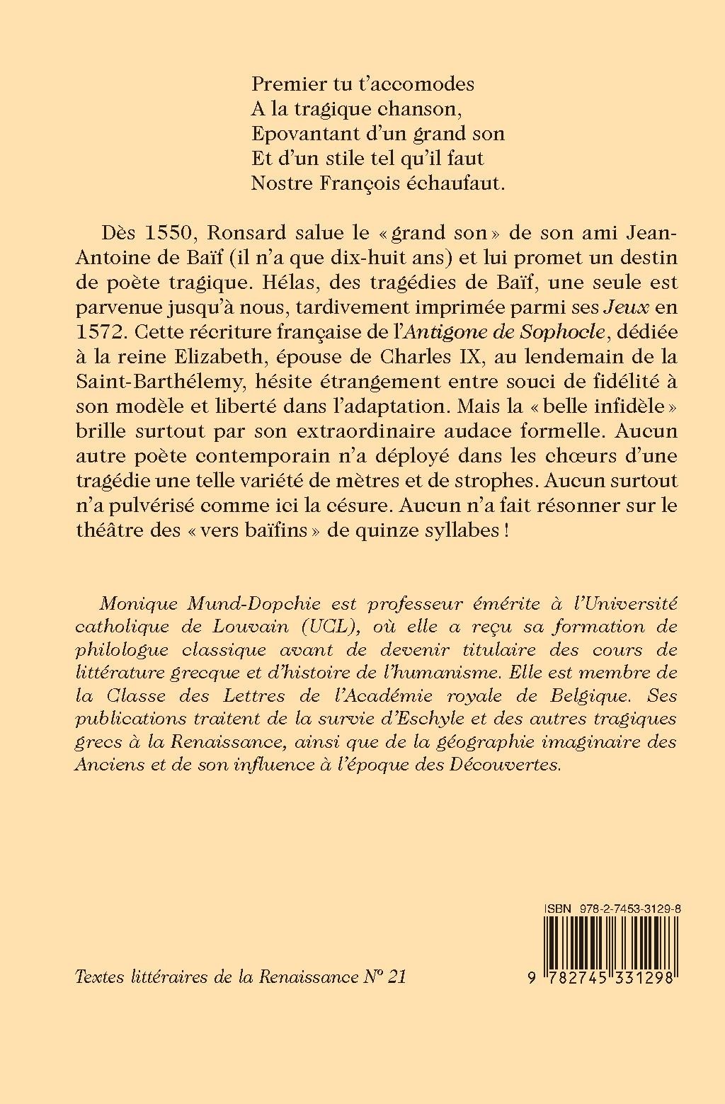 Dès 1550, Ronsard salue le « grand son » de son ami Jean- Antoine de Baïf (il n’a que dix-huit ans) et lui promet un destin de poète tragique. Hélas, des tragédies de Baïf, une seule est parvenue jusqu’à nous, tardivement imprimée parmi ses Jeux en 1572. Cette récriture française de l’Antigone de Sophocle, dédiée à la reine Elizabeth, épouse de Charles IX, au lendemain de la Saint-Barthélemy, hésite étrangement entre souci de fidélité à son modèle et liberté dans l’adaptation. Mais la « belle infidèle » brille surtout par son extraordinaire audace formelle. Aucun autre poète contemporain n’a déployé dans les choeurs d’une tragédie une telle variété de mètres et de strophes. Aucun surtout n’a pulvérisé comme ici la césure. Aucun n’a fait résonner sur le théâtre des « vers baïfins » de quinze syllabes !