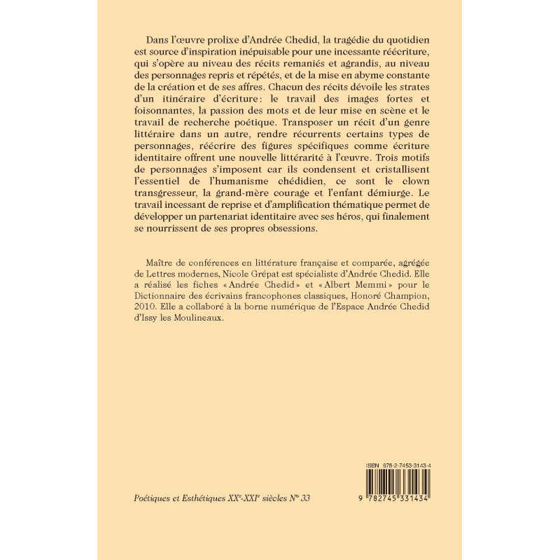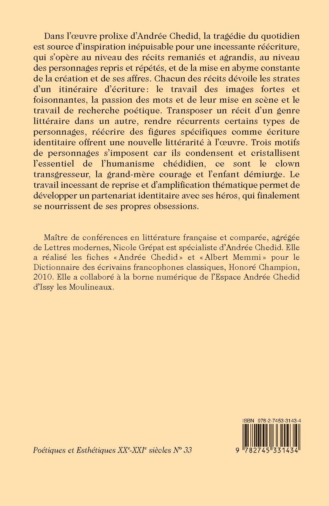 Dans l’oeuvre prolixe d’Andrée Chedid, la tragédie du quotidien est source d’inspiration inépuisable pour une incessante réécriture, qui s’opère au niveau des récits remaniés et agrandis, au niveau des personnages repris et répétés, et de la mise en abyme constante de la création et de ses affres. Chacun des récits dévoile les strates d’un itinéraire d’écriture : le travail des images fortes et foisonnantes, la passion des mots et de leur mise en scène et le travail de recherche poétique. Transposer un récit d’un genre littéraire dans un autre, rendre récurrents certains types de personnages, réécrire des figures spécifiques comme écriture identitaire offrent une nouvelle littérarité à l’oeuvre. Trois motifs de personnages s’imposent car ils condensent et cristallisent l’essentiel de l’humanisme chédidien, ce sont le clown transgresseur, la grand-mère courage et l’enfant démiurge. Le travail incessant de reprise et d’amplification thématique permet de développer un partenariat identitaire avec ses héros, qui finalement se nourrissent de ses propres obsessions.
