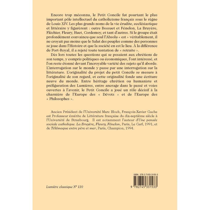 Encore trop méconnu, le Petit Concile fut pourtant le plus important pôle intellectuel du catholicisme français sous le règne de Louis XIV. Les plus grands noms de la vie érudite, ecclésiastique et littéraire y figurèrent : outre Bossuet et Fénelon, La Bruyère, Fléchier, Fleury, Huet, Cordemoy, et tant d’autres. Si le groupe était profondément convaincu que seul l’Absolu « est » véritablement, il ne croyait pas moins que le Salut des peuples comme des personnes se joue dans l’Histoire et que la société en est le lieu. À la différence de Port-Royal, il a rejeté toute tentation de « retraite ».