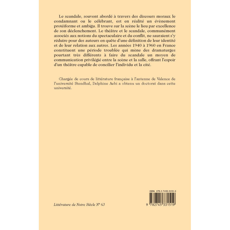 Le scandale, souvent abordé à travers des discours moraux le condamnant ou le célébrant, est en réalité un évènement protéiforme et ambigu. Il trouve sur la scène le lieu par excellence de son déclenchement. Le théâtre et le scandale, communément associés aux notions du spectaculaire et du conflit, ne sauraient s’y réduire pour des auteurs en quête d’une définition de leur identité et de leur relation aux autres. Les années 1940 à 1960 en France constituent une période troublée qui mène des dramaturges pourtant très différents à faire du scandale un moyen de communication privilégié entre la scène et la salle, offrant l’espoir d’un théâtre capable de concilier l’individu et la cité.