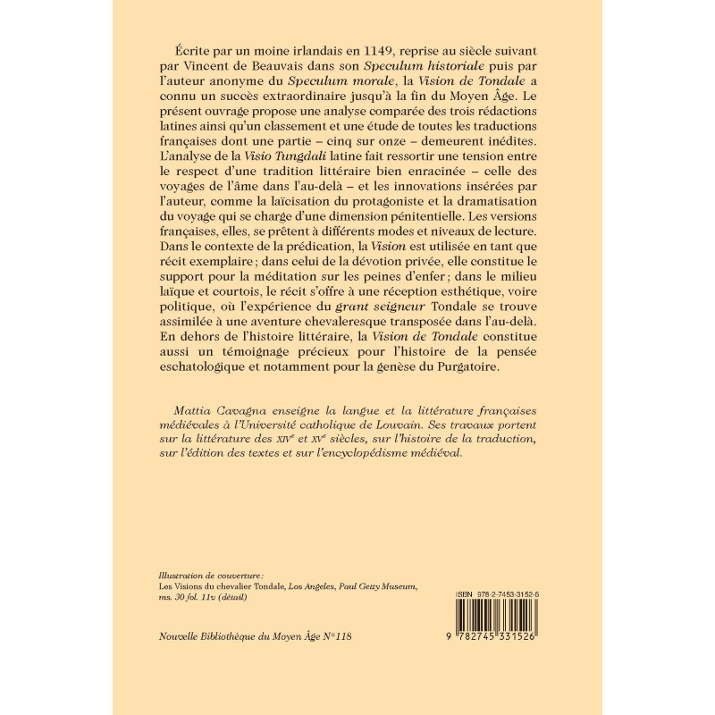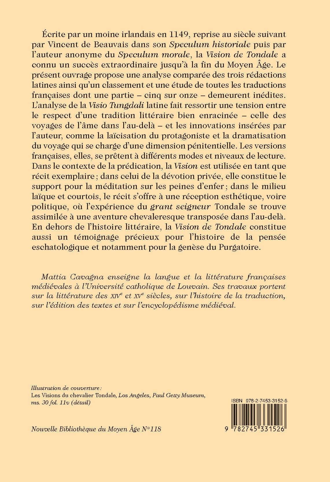 Ecrite par un moine irlandais en 1149, reprise au siècle suivant par Vincent de Beauvais dans son Speculum historiale puis par l’auteur anonyme du Speculum morale, la Vision de Tondale a connu un succès extraordinaire jusqu’à la fin du Moyen Âge. Le présent ouvrage propose une analyse comparée des trois rédactions latines ainsi qu’un classement et une étude de toutes les traductions françaises dont une partie – cinq sur onze – demeurent inédites. L’analyse de la Visio Tungdali latine fait ressortir une tension entre le respect d’une tradition littéraire bien enracinée – celle des voyages de l’âme dans l’au-delà – et les innovations insérées par l’auteur, comme la laïcisation du protagoniste et la dramatisation du voyage qui se charge d’une dimension pénitentielle. Les versions françaises, elles, se prêtent à différents modes et niveaux de lecture. Dans le contexte de la prédication, la Vision est utilisée en tant que récit exemplaire ; dans celui de la dévotion privée, elle constitue le support pour la méditation sur les peines d’enfer ; dans le milieu laïque et courtois, le récit s’offre à une réception esthétique, voire politique, où l’expérience du grant seigneur Tondale se trouve assimilée à une aventure chevaleresque transposée dans l’au-delà. En dehors de l’histoire littéraire, la Vision de Tondale constitue aussi un témoignage précieux pour l’histoire de la pensée eschatologique et notamment pour la genèse du Purgatoire.