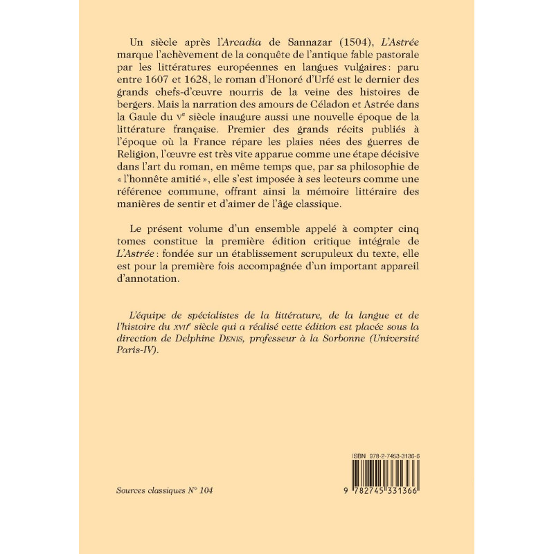 Un siècle après l’Arcadia de Sannazar (1504), L’Astrée marque l’achèvement de la conquête de l’antique fable pastorale par les littératures européennes en langues vulgaires : paru entre 1607 et 1628, le roman d’Honoré d’Urfé est le dernier des grands chefs-d’œuvre nourris de la veine des histoires de bergers. Mais la narration des amours de Céladon et Astrée dans la Gaule du Ve siècle inaugure aussi une nouvelle époque de la littérature française. Premier des grands récits publiés à l’époque où la France répare les plaies nées des guerres de Religion, l’œuvre est très vite apparue comme une étape décisive dans l’art du roman, en même temps que, par sa philosophie de « l’honnête amitié », elle s’est imposée à ses lecteurs comme une référence commune, offrant ainsi la mémoire littéraire des manières de sentir et d’aimer de l’âge classique. Le présent volume d’un ensemble appelé à compter cinq tomes constitue la première édition critique intégrale de L’Astrée : fondée sur un établissement scrupuleux du texte, elle est pour la première fois accompagnée d’un important appareil d’annotation.