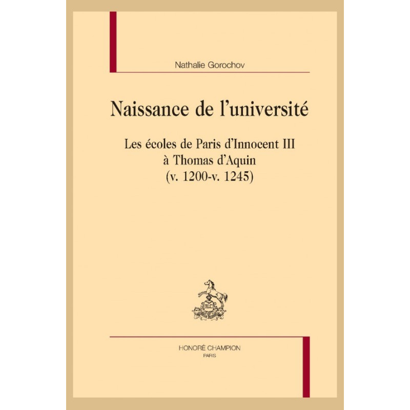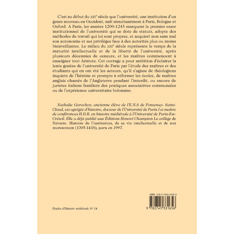 C’est au début du XIIIe siècle que l’université, une institution d’un genre nouveau en Occident, naît simultanément à Paris, Bologne et Oxford. A Paris, les années 1200-1245 marquent le premier essor institutionnel de l’université qui se dote de statuts, adopte des méthodes de travail qui lui sont propres, et acquiert non sans mal son autonomie et ses privilèges face à des autorités plus ou moins bienveillantes. Le milieu du XIIIe siècle représente le temps de la maturité intellectuelle et de la liberté de l’université, après plusieurs décennies de censure, et les maîtres commencent à enseigner tout Aristote. Cet ouvrage a pour ambition d’éclairer la lente genèse de l’université de Paris par l’étude des maîtres et des étudiants qui en ont été les acteurs, qu’il s’agisse de théologiens inquiets de l’hérésie et prompts à réformer les écoles, de maîtres anglais chassés de l’Angleterre pendant l’interdit, ou encore de juristes italiens familiers des pratiques associatives communales ou de l’expérience universitaire bolonaise.