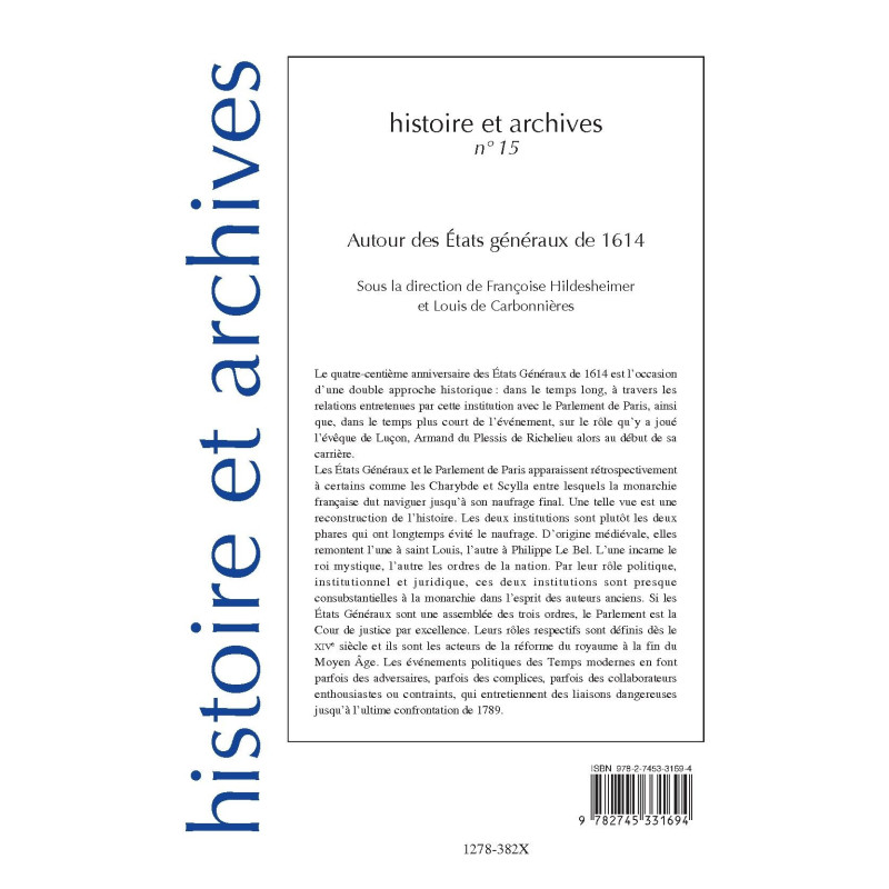 Le quatre-centième anniversaire des États Généraux de 1614 est l’occasion d’une double approche historique : dans le temps long, à travers les relations entretenues par cette institution avec le Parlement de Paris, ainsi que, dans le temps plus court de l’événement, sur le rôle qu’y a joué l’évêque de Luçon, Armand du Plessis de Richelieu alors au début de sa carrière.