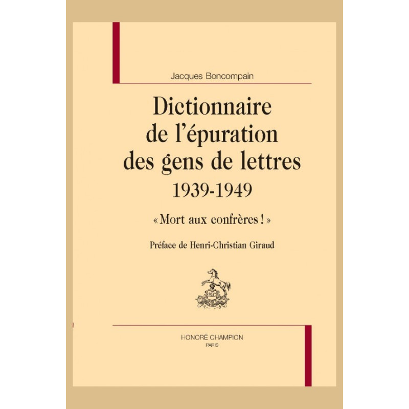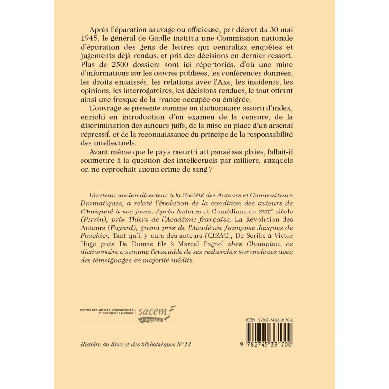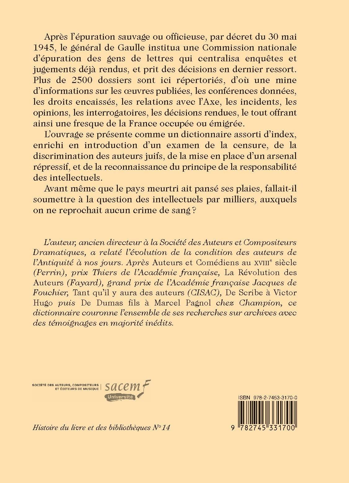 Après l’épuration sauvage ou officieuse, par décret du 30 mai 1945, le général de Gaulle institua une Commission nationale d’épuration des gens de lettres qui centralisa enquêtes et jugements déjà rendus, et prit des décisions en dernier ressort. Plus de 2500 dossiers sont ici répertoriés, d’où une mine d’informations sur les œuvres publiées, les conférences données, les droits encaissés, les relations avec l’Axe, les incidents, les opinions, les interrogatoires, les décisions rendues, le tout offrant ainsi une fresque de la France occupée ou émigrée.