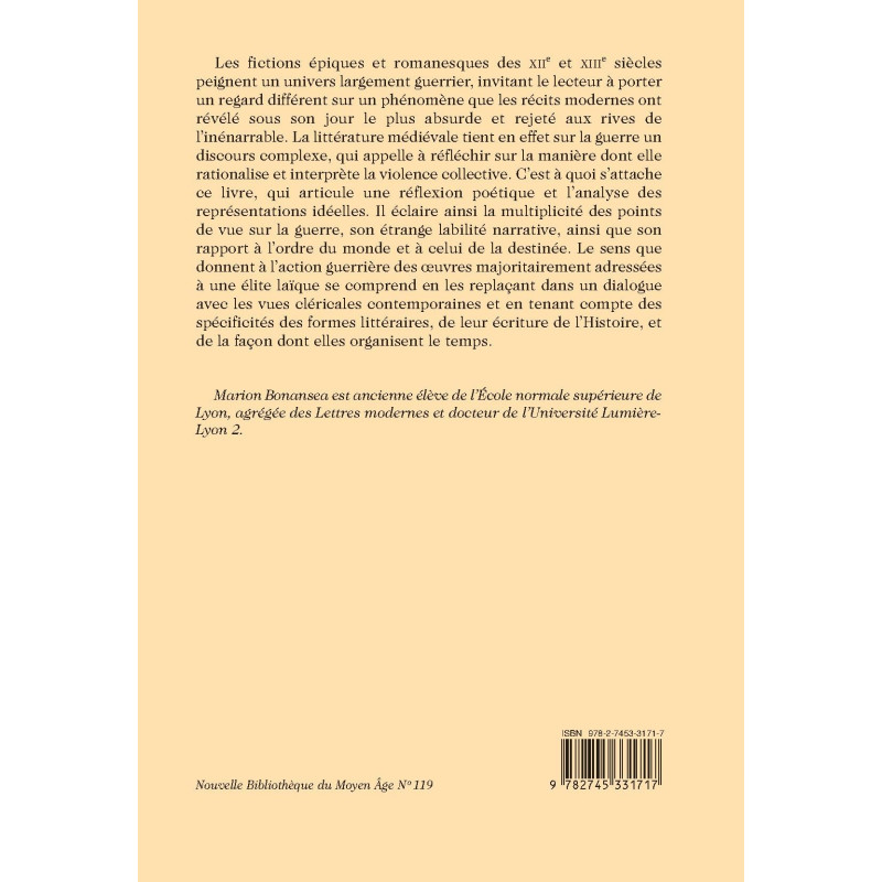 The complex view of war given by 12th- and 13th-c. epics and romances is best understood by considering their dialogue with ecclesiastical theses, without dismissing the poetic specificities of literary forms. This book explores the relationships between war and an overall representation of order, and of the sense of History.
