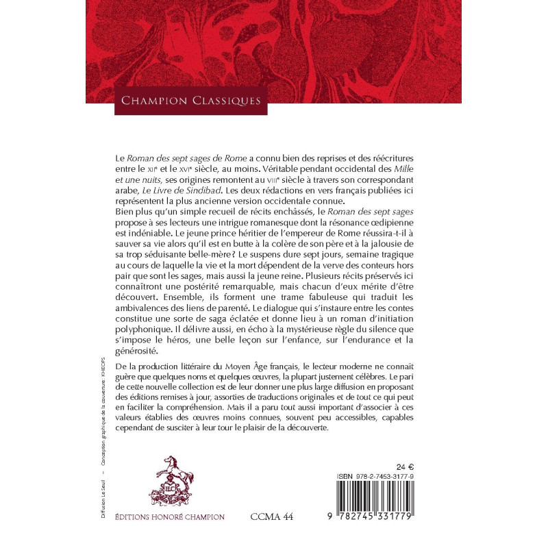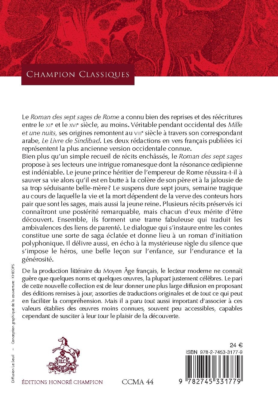 Le Roman des sept sages de Rome a connu bien des reprises et des réécritures entre le XIIe et le XVIe siècle, au moins. Véritable pendant occidental des Mille et une nuits, ses origines remontent au VIIIe siècle à travers son correspondant arabe, Le Livre de Sindibad. Les deux rédactions en vers français publiées ici représentent la plus ancienne version occidentale connue.