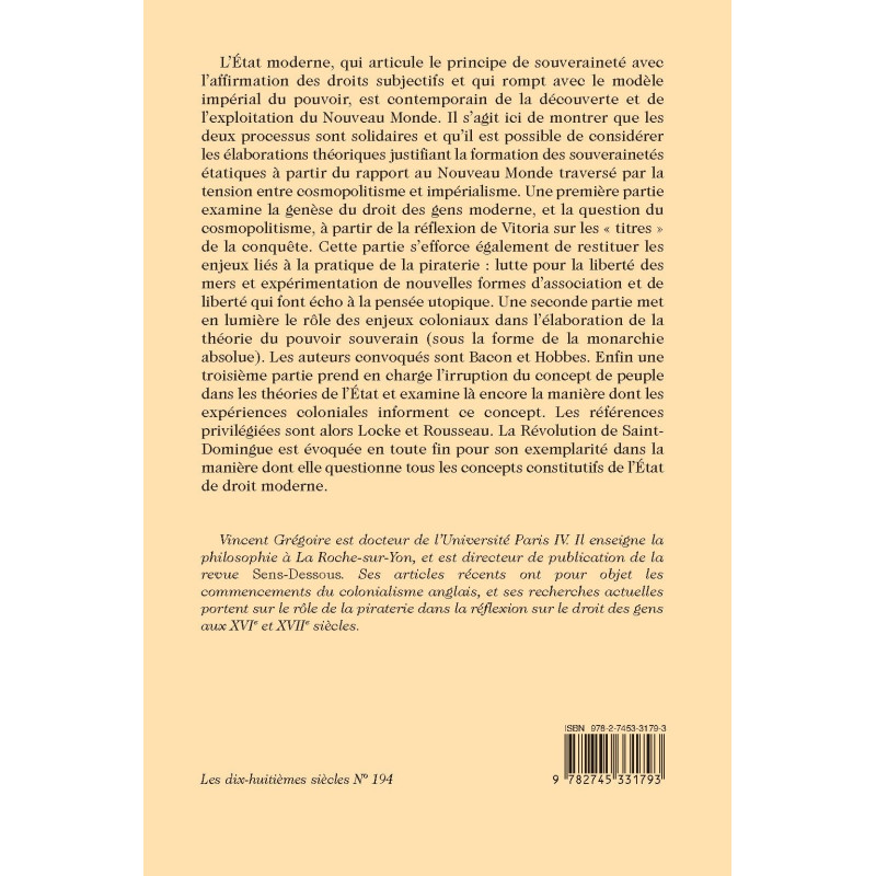 L’État moderne, qui articule le principe de souveraineté avec l’affirmation des droits subjectifs et qui rompt avec le modèle impérial du pouvoir, est contemporain de la découverte et de l’exploitation du Nouveau Monde. Il s’agit ici de montrer que les deux processus sont solidaires et qu’il est possible de considérer les élaborations théoriques justifiant la formation des souverainetés étatiques à partir du rapport au Nouveau Monde traversé par la tension entre cosmopolitisme et impérialisme. Une première partie examine la genèse du droit des gens moderne, et la question du cosmopolitisme, à partir de la réflexion de Vitoria sur les « titres » de la conquête. Cette partie s’efforce également de restituer les enjeux liés à la pratique de la piraterie : lutte pour la liberté des mers et expérimentation de nouvelles formes d’association et de liberté qui font écho à la pensée utopique. Une seconde partie met en lumière le rôle des enjeux coloniaux dans l’élaboration de la théorie du pouvoir souverain (sous la forme de la monarchie absolue). Les auteurs convoqués sont Bacon et Hobbes. Enfin une troisième partie prend en charge l’irruption du concept de peuple dans les théories de l’État et examine là encore la manière dont les expériences coloniales informent ce concept. Les références privilégiées sont alors Locke et Rousseau. La Révolution de Saint- Domingue est évoquée en toute fin pour son exemplarité dans la manière dont elle questionne tous les concepts constitutifs de l’État de droit moderne.