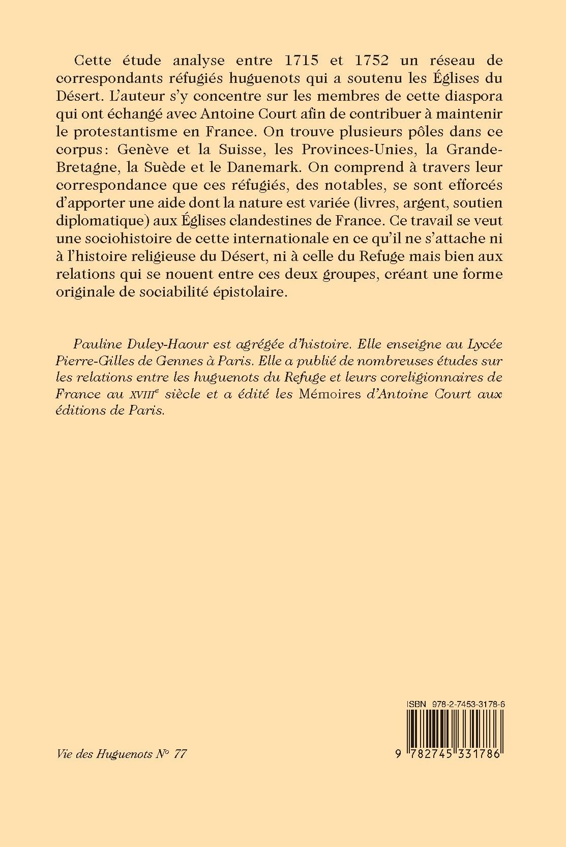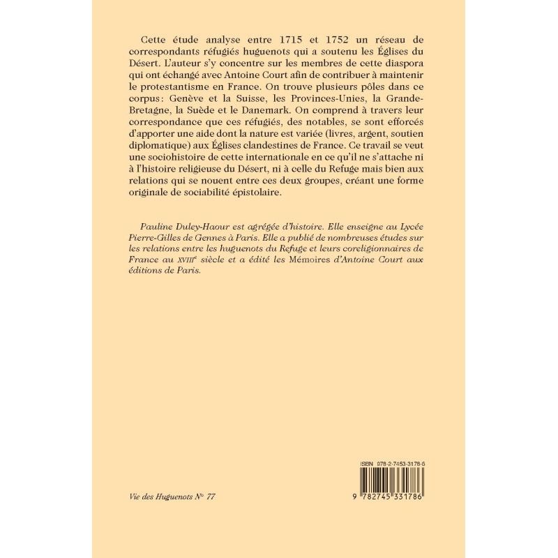 Pauline Duley-Haour est agrégée d’histoire. Elle enseigne au Lycée Pierre-Gilles de Gennes à Paris. Elle a publié de nombreuses études sur les relations entre les huguenots du Refuge et leurs coreligionnaires de France au XVIIIe siècle et a édité les Mémoires d’Antoine Court aux éditions de Paris.