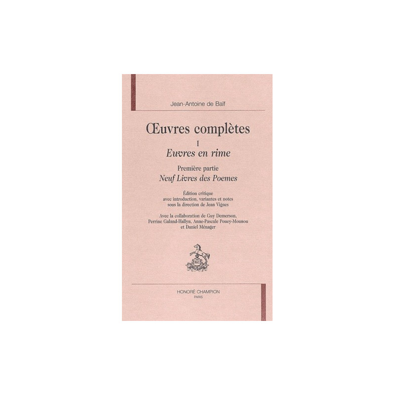 Poète de la "Pléiade", fondateur de la fameuse Académie de Poésie et de Musique, Jean-Antoine de Baïf fut l'un des auteurs les plus en vue de son siècle, l'un des plus féconds aussi. A l'heure où l'on redécouvre le rôle qui fut le sien dans le renouveau artistique issu de l'humanisme, cette première édition de ses Œuvres complètes rassemble autour de chaque texte les informations qui en éclairent le projet et la signification.