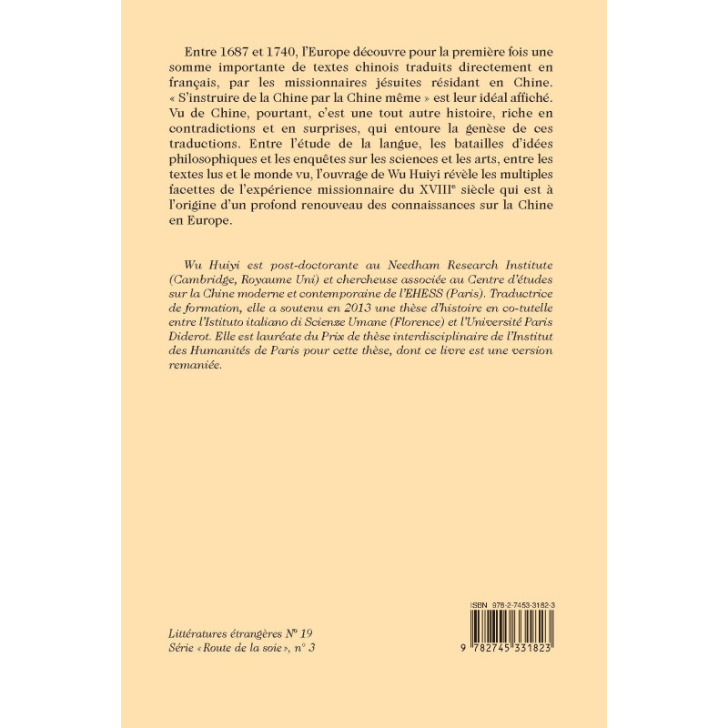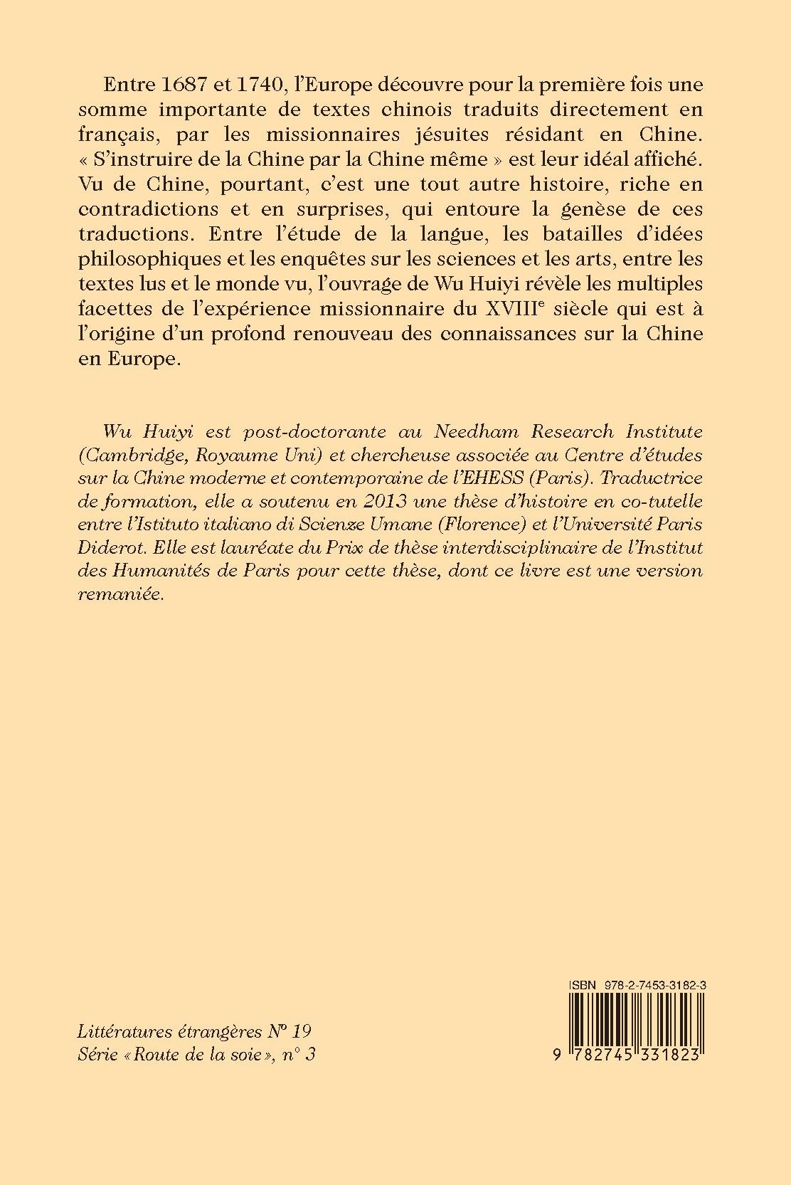 Entre 1687 et 1740, l’Europe découvre pour la première fois une somme importante de textes chinois traduits directement en français, par les missionnaires jésuites résidant en Chine. « S’instruire de la Chine par la Chine même » est leur idéal affiché. Vu de Chine, pourtant, c’est une tout autre histoire, riche en contradictions et en surprises, qui entoure la genèse de ces traductions. Entre l’étude de la langue, les batailles d’idées philosophiques et les enquêtes sur les sciences et les arts, entre les textes lus et le monde vu, l’ouvrage de Wu Huiyi révèle les multiples facettes de l’expérience missionnaire du XVIIIe siècle qui est à l’origine d’un profond renouveau des connaissances sur la Chine en Europe.