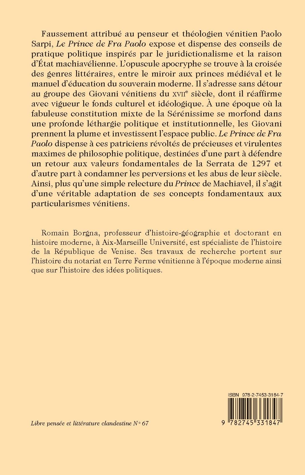 Faussement attribué au penseur et théologien vénitien Paolo Sarpi, Le Prince de Fra Paolo expose et dispense des conseils de pratique politique inspirés par le juridictionalisme et la raison d’État machiavélienne. L’opuscule apocryphe se trouve à la croisée des genres littéraires, entre le miroir aux princes médiéval et le manuel d’éducation du souverain moderne. Il s’adresse sans détour au groupe des Giovani vénitiens du XVIIe siècle, dont il réaffirme avec vigueur le fonds culturel et idéologique. À une époque où la fabuleuse constitution mixte de la Sérénissime se morfond dans une profonde léthargie politique et institutionnelle, les Giovani prennent la plume et investissent l’espace public. Le Prince de Fra Paolo dispense à ces patriciens révoltés de précieuses et virulentes maximes de philosophie politique, destinées d’une part à défendre un retour aux valeurs fondamentales de la Serrata de 1297 et d’autre part à condamner les perversions et les abus de leur siècle. Ainsi, plus qu’une simple relecture du Prince de Machiavel, il s’agit d’une véritable adaptation de ses concepts fondamentaux aux particularismes vénitiens.