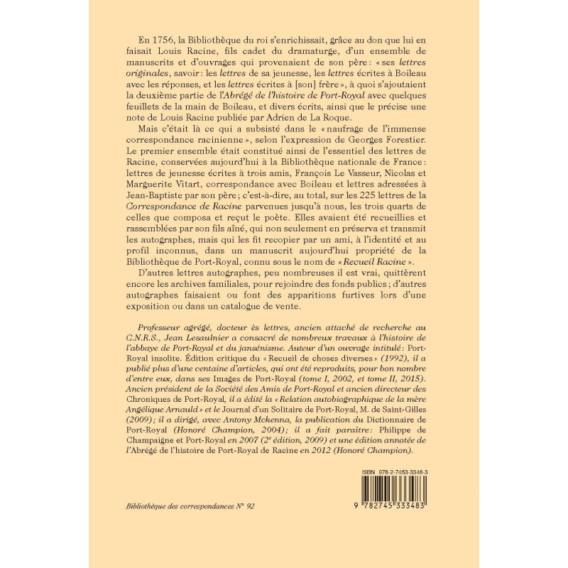 Mais c’était là ce qui a subsisté dans le « naufrage de l’immense correspondance racinienne », selon l’expression de Georges Forestier. Le premier ensemble était constitué ainsi de l’essentiel des lettres de Racine, conservées aujourd’hui à la Bibliothèque nationale de France : lettres de jeunesse écrites à trois amis, François Le Vasseur, Nicolas et Marguerite Vitart, correspondance avec Boileau et lettres adressées à Jean-Baptiste par son père ; c’est-à-dire, au total, sur les 225 lettres de la Correspondance de Racine parvenues jusqu’à nous, les trois quarts de celles que composa et reçut le poète. Elles avaient été recueillies et rassemblées par son fils aîné, qui non seulement en préserva et transmit les autographes, mais qui les fit recopier par un ami, à l’identité et au profil inconnus, dans un manuscrit aujourd’hui propriété de la Bibliothèque de Port-Royal, connu sous le nom de « Recueil Racine ».
