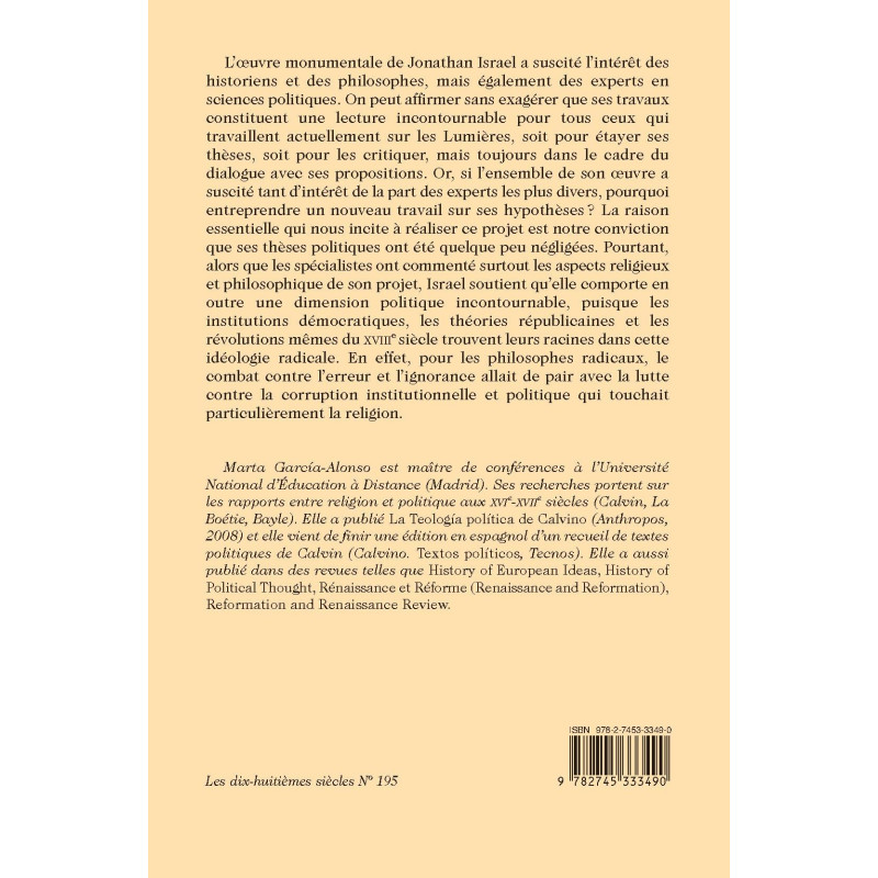 L’oeuvre monumentale de Jonathan Israel a suscité l’intérêt des historiens et des philosophes, mais également des experts en sciences politiques. On peut affirmer sans exagérer que ses travaux constituent une lecture incontournable pour tous ceux qui travaillent actuellement sur les Lumières, soit pour étayer ses thèses, soit pour les critiquer, mais toujours dans le cadre du dialogue avec ses propositions. Or, si l’ensemble de son oeuvre a suscité tant d’intérêt de la part des experts les plus divers, pourquoi entreprendre un nouveau travail sur ses hypothèses ? La raison essentielle qui nous incite à réaliser ce projet est notre conviction que ses thèses politiques ont été quelque peu négligées. Pourtant, alors que les spécialistes ont commenté surtout les aspects religieux et philosophique de son projet, Israel soutient qu’elle comporte en outre une dimension politique incontournable, puisque les institutions démocratiques, les théories républicaines et les révolutions mêmes du XVIIIe siècle trouvent leurs racines dans cette idéologie radicale. En effet, pour les philosophes radicaux, le combat contre l’erreur et l’ignorance allait de pair avec la lutte contre la corruption institutionnelle et politique qui touchait particulièrement la religion.