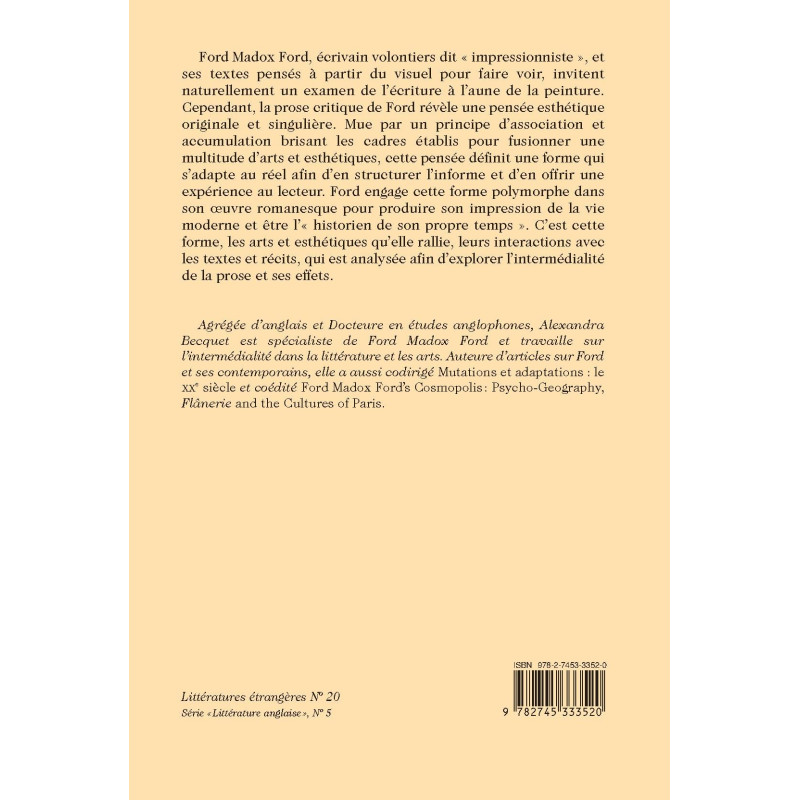 Ford Madox Ford, écrivain volontiers dit « impressionniste », et ses textes pensés à partir du visuel pour faire voir, invitent naturellement un examen de l’écriture à l’aune de la peinture. Cependant, la prose critique de Ford révèle une pensée esthétique originale et singulière. Mue par un principe d’association et accumulation brisant les cadres établis pour fusionner une multitude d’arts et esthétiques, cette pensée définit une forme qui s’adapte au réel afin d’en structurer l’informe et d’en offrir une expérience au lecteur. Ford engage cette forme polymorphe dans son oeuvre romanesque pour produire son impression de la vie moderne et être l’« historien de son propre temps ». C’est cette forme, les arts et esthétiques qu’elle rallie, leurs interactions avec les textes et récits, qui est analysée afin d’explorer l’intermédialité de la prose et ses effets.