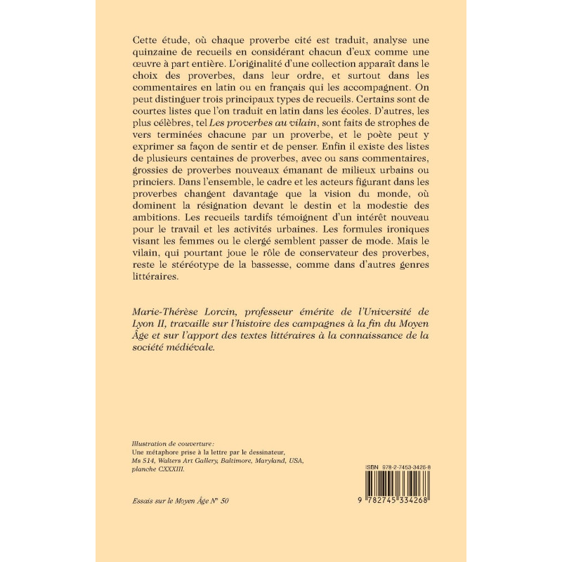 Cette étude, où chaque proverbe cité est traduit, analyse une quinzaine de recueils en considérant chacun d’eux comme une œuvre à part entière. L’originalité d’une collection apparaît dans le choix des proverbes, dans leur ordre, et surtout dans les commentaires en latin ou en français qui les accompagnent. On peut distinguer trois principaux types de recueils. Certains sont de courtes listes que l’on traduit en latin dans les écoles. D’autres, les plus célèbres, tel Les proverbes au vilain, sont faits de strophes de vers terminées chacune par un proverbe, et le poète peut y exprimer sa façon de sentir et de penser. Enfin il existe des listes de plusieurs centaines de proverbes, avec ou sans commentaires, grossies de proverbes nouveaux émanant de milieux urbains ou princiers. Dans l’ensemble, le cadre et les acteurs figurant dans les proverbes changent davantage que la vision du monde, où dominent la résignation devant le destin et la modestie des ambitions. Les recueils tardifs témoignent d’un intérêt nouveau pour le travail et les activités urbaines. Les formules ironiques visant les femmes ou le clergé semblent passer de mode. Mais le vilain, qui pourtant joue le rôle de conservateur des proverbes, reste le stéréotype de la bassesse, comme dans d’autres genres littéraires.