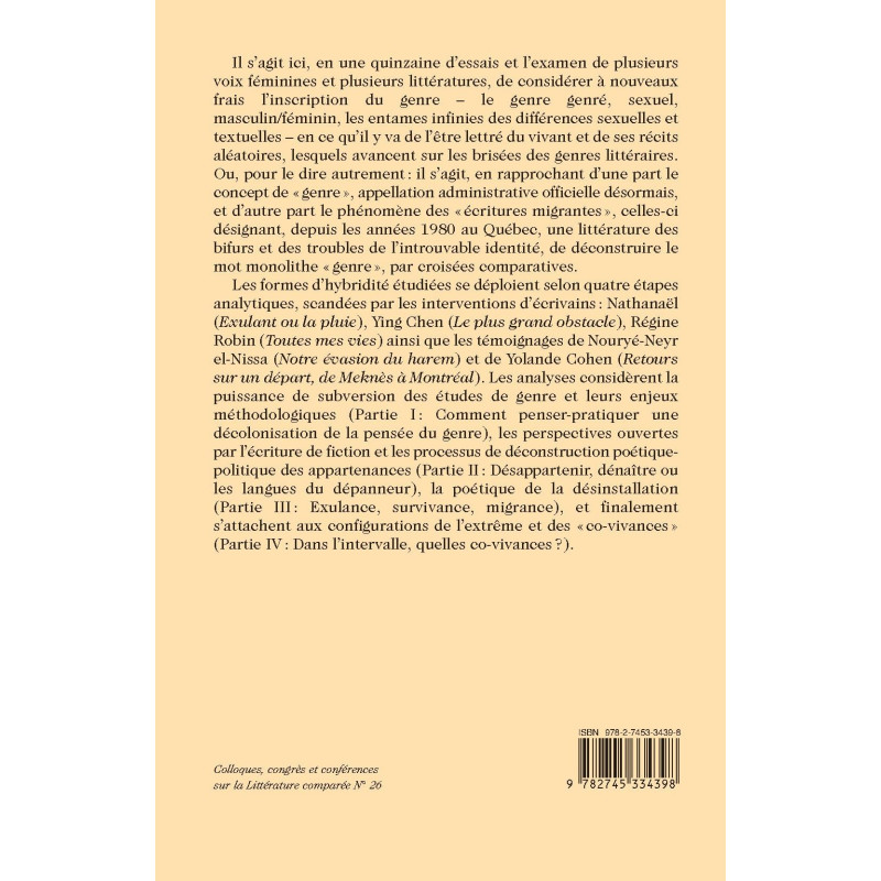 Il s’agit ici, en une quinzaine d’essais et l’examen de plusieurs voix féminines et plusieurs littératures, de considérer à nouveaux frais l’inscription du genre – le genre genré, sexuel, masculin/féminin, les entames infinies des différences sexuelles et textuelles – en ce qu’il y va de l’être lettré du vivant et de ses récits aléatoires, lesquels avancent sur les brisées des genres littéraires. Ou, pour le dire autrement : il s’agit, en rapprochant d’une part le concept de « genre », appellation administrative officielle désormais, et d’autre part le phénomène des « écritures migrantes », celles-ci désignant, depuis les années 1980 au Québec, une littérature des bifurs et des troubles de l’introuvable identité, de déconstruire le mot monolithe « genre », par croisées comparatives.