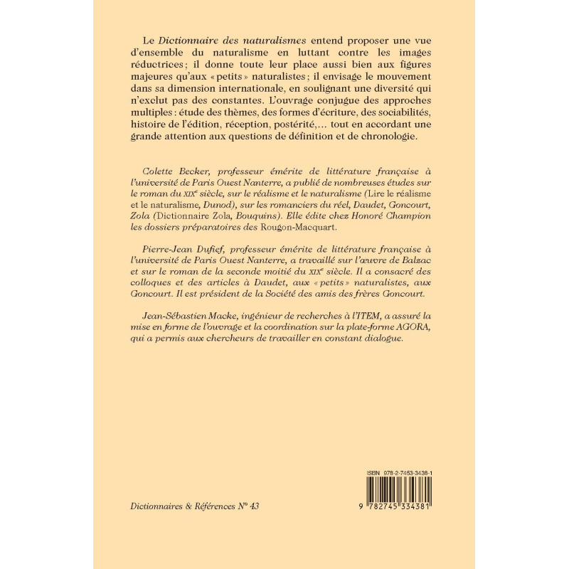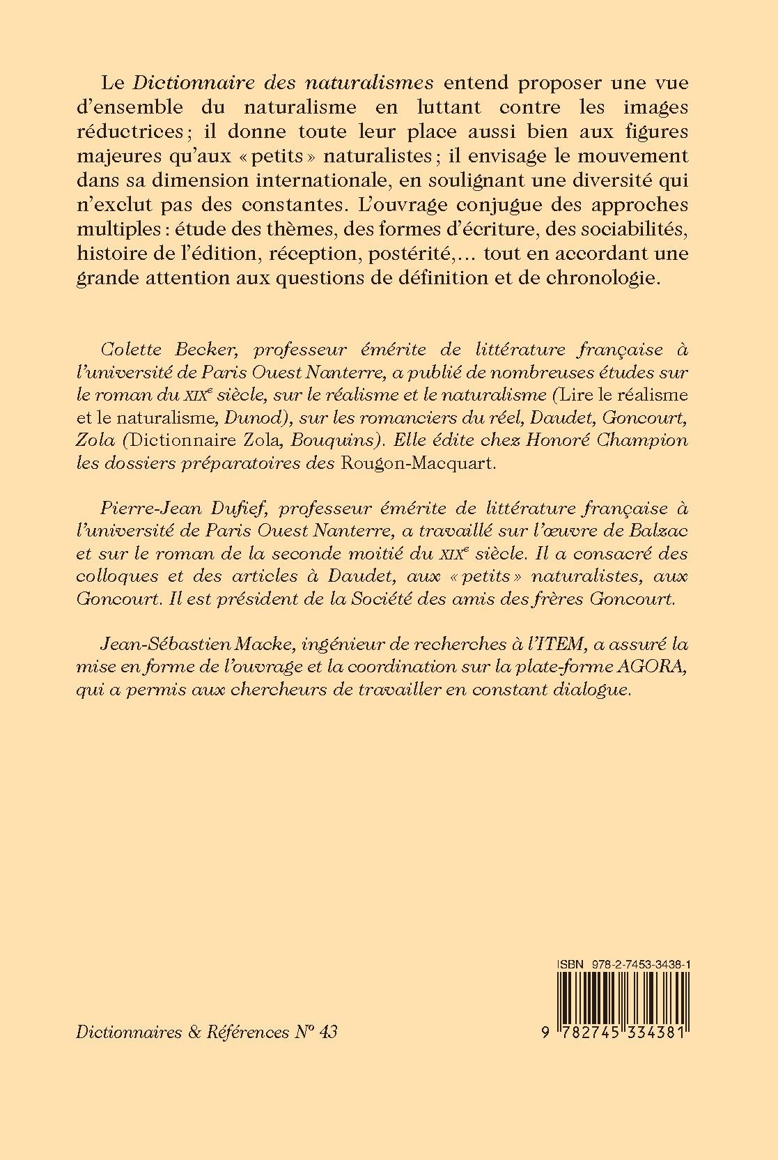 Le Dictionnaire des naturalismes entend proposer une vue d’ensemble du naturalisme en luttant contre les images réductrices ; il donne toute leur place aussi bien aux figures majeures qu’aux « petits » naturalistes ; il envisage le mouvement dans sa dimension internationale, en soulignant une diversité qui n’exclut pas des constantes. L’ouvrage conjugue des approches multiples : étude des thèmes, des formes d’écriture, des sociabilités, histoire de l’édition, réception, postérité,… tout en accordant une grande attention aux questions de définition et de chronologie.